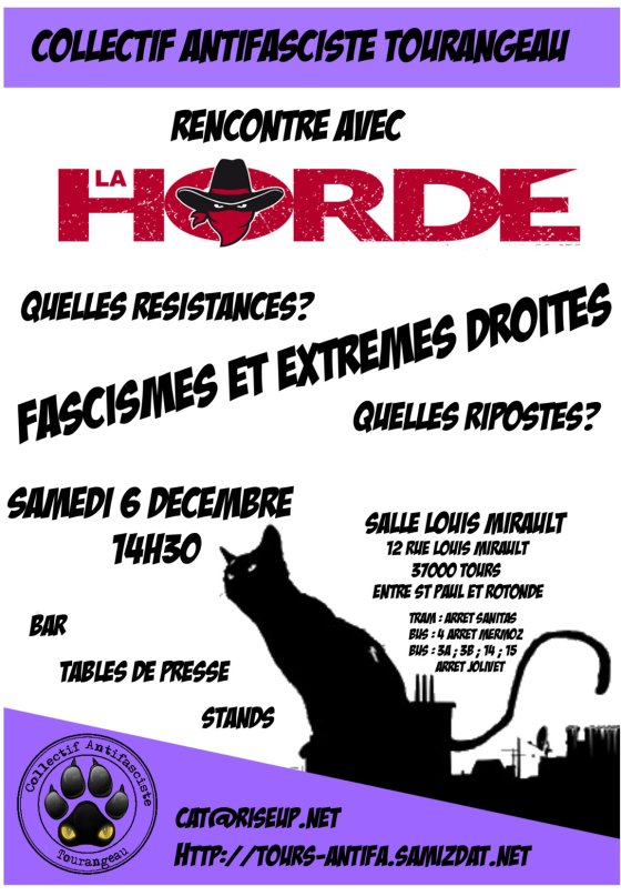 L’extrême droite française a connu ces derniers années des bouleversements qui ont changé sa physionomie. Dans le même temps, les représentations du mouvement nationaliste n’ont pas vraiment évolué dans l’opinion : or, pour la combattre efficacement, il est nécessaire de bien connaître l’extrême droite, à la fois dans son évolution récente et dans son état actuel, afin d’adapter la riposte antifasciste à la réalité. C’est pourquoi nous vous proposons, après un diaporama qui présente les grandes « familles » de l’extrême droite, de débattre avec nous sur les moyens les plus efficaces pour les combattre.
