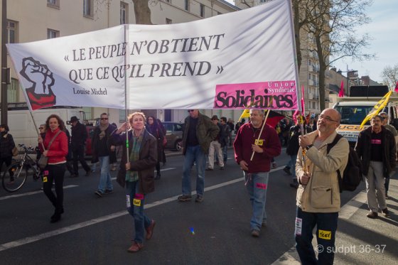 Dans le cortège de SOLIDAIRES 37, principalement représentés les postier-e-s et télécommunicant-e-s, les cheminots, les enseignant-e-s, les camarades de la protection sociale, de la Culture, de Michelin, des finances publiques, des étudiants, des travailleurs sociaux, etc.
