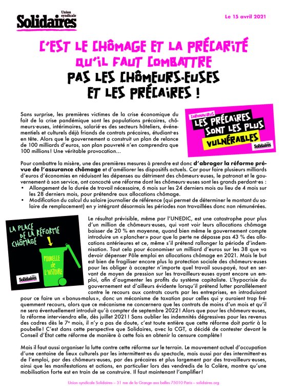 C’EST LE CHÔMAGE ET LA PRÉCARITÉ QU’IL FAUT COMBATTRE PAS LES CHÔMEURS•EUSES ET LES PRÉCAIRES ! RDV le vendredi 23 avril à 14h30 devant la Direccte, rue Flemming, Tours