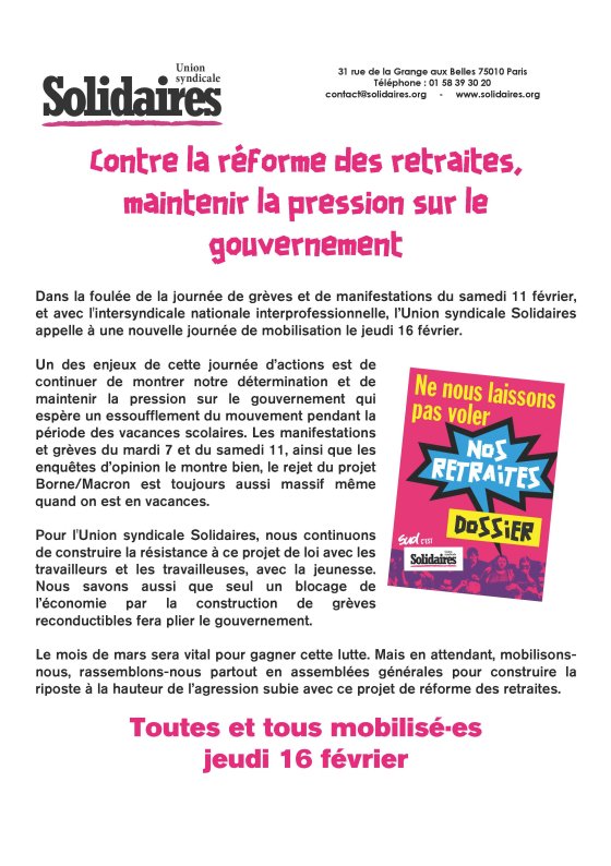 RDV jeudi 16 février à 14h place Jean Jaurès. Appels intersyndical et solidaires ci-dessous
