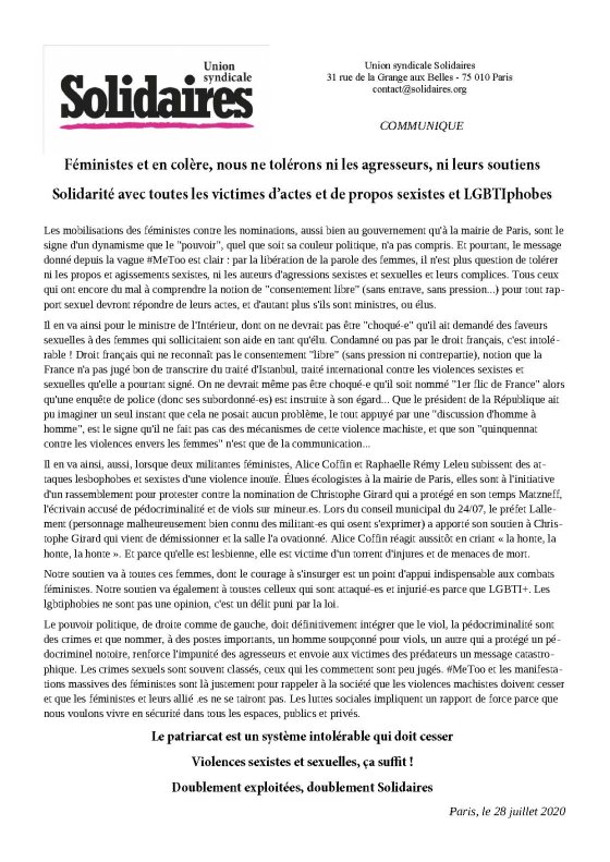 Féministes et en colère, nous ne tolérons ni les agresseurs, ni leurs soutiens, solidarité avec toutes les victimes d’actes et de propos sexistes et LGBTIphobes