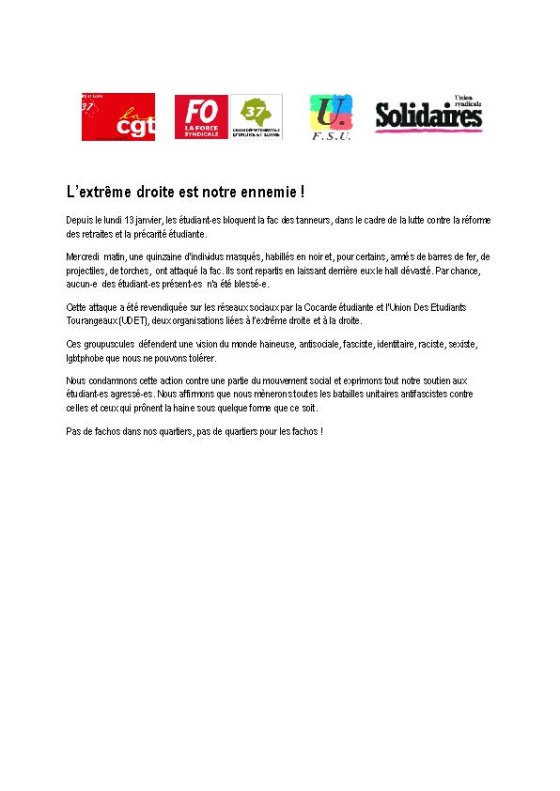 NON au RACISME, NON aux FASCISTES, NON aux VIOLENCES D’ÉTAT, SOLIDARITÉ ! SAMEDI 14 MARS 2026 à 16h30 place Jean Jaurès