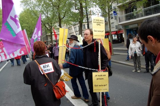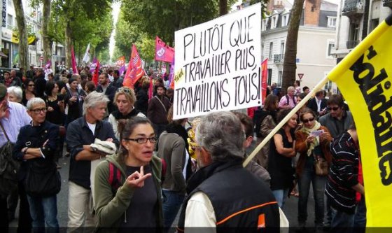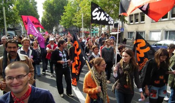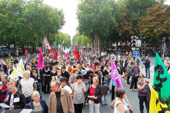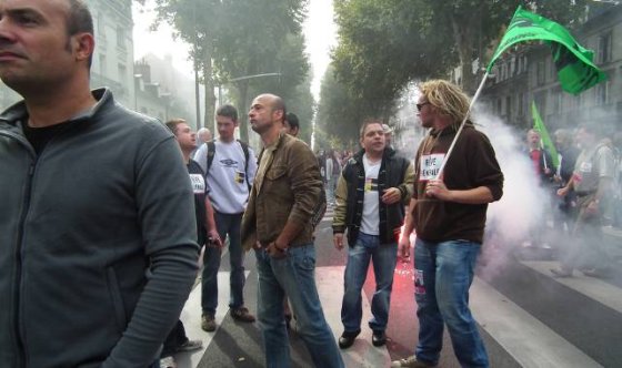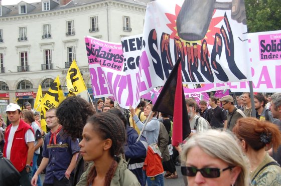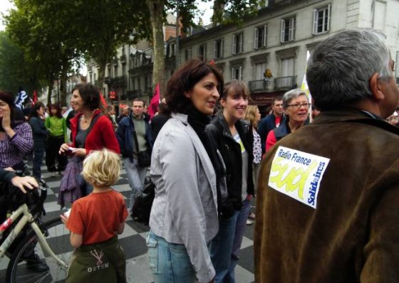 Sur les banderoles, les slogans fleurissent en ce premier jour d’automne : « Sarko, on n’est pas des robots ! », ou encore : « La crise, les uns la paient, les autres l’empochent ». Le refrain « Les vieux dans la misère, les jeunes dans la galère » reste bien placé au hit-parade. Cheminots, métallos, municipaux de Tours et Saint-Pierre, EDF-GDF, SKF, Pfizer, Michelin, Fil bleu, NR, Finance publique, CHU et ses blouses blanches, les caisses et l’Éducation, quelques lycées (Monnet, d’Arsonval, Descartes), université et enseignement libre catholique, Inra et Faiveley, le conseil général, une dizaine de pompiers en tenue, tous sont du rendez-vous. Sud et Solidaires en force, FO en forme, CGT toujours omniprésente, CFDT plus discrète, dit-on. Beaucoup d’anciens, peu de jeunes. Quelques fumigènes et vuvuzela. Voilà pour l’ambiance d’hier à Tours.
