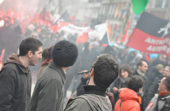A leurs côtés, des délégations du Parti Socialiste (dont la présidente du conseil général Claude Roiron ou le député Jean-Patrick Gille), mais également des particuliers hésitant sur la place à prendre dans ce cortège rouge et noir. La présence d’une quarantaine de porteurs de capuches, foulards et blousons noirs laissait augurer une radicalisation du mouvement. Le défilé s’est acheminé sans encombre place Jean-Jaurès, sous escorte discrète.