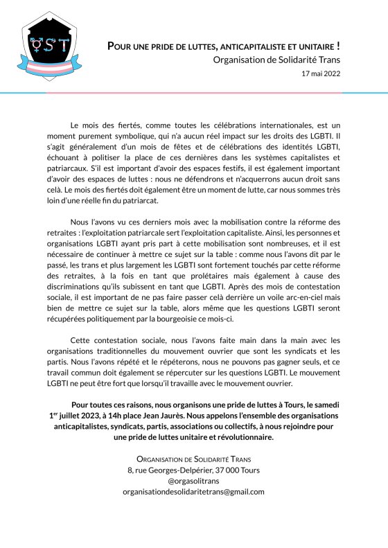 - 📣 8 mars, c’est parti ! Et le programme sur Tours est chouette : ⚧️ Toustes dans la rue en manifestation, départ à 11h place de la Liberté pour aller à Velpeau ⚧️ Village féministe à partir de 12h30 au Patronage laïque La Fuye (4 rue Montesquieu à Tours)