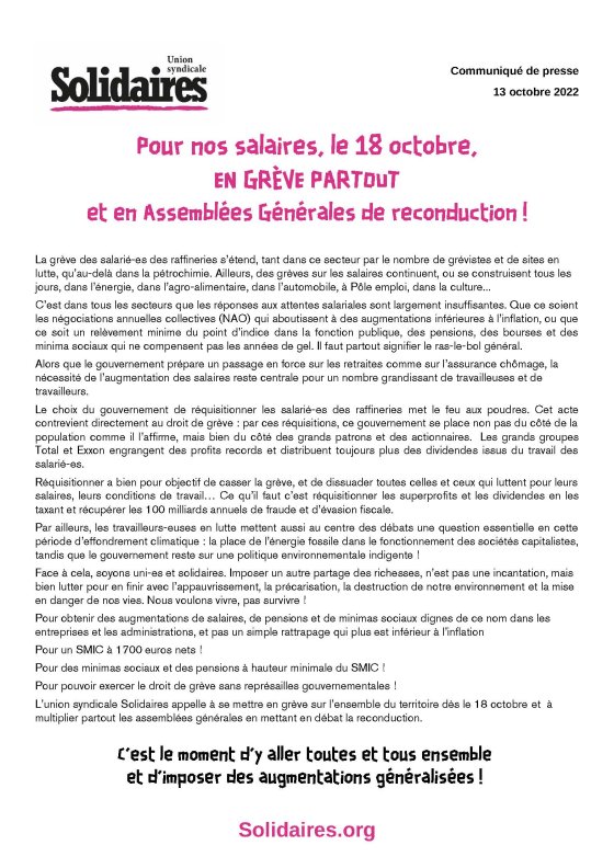 Pour nos salaires, le 18 octobre, EN GRÈVE et en Assemblées Générales de reconduction partout où c’est possible ! Manifestation 14h place Jean Jaurès ! C’est le moment d’y aller toutes et tous ensemble et d’imposer des augmentations généralisées !