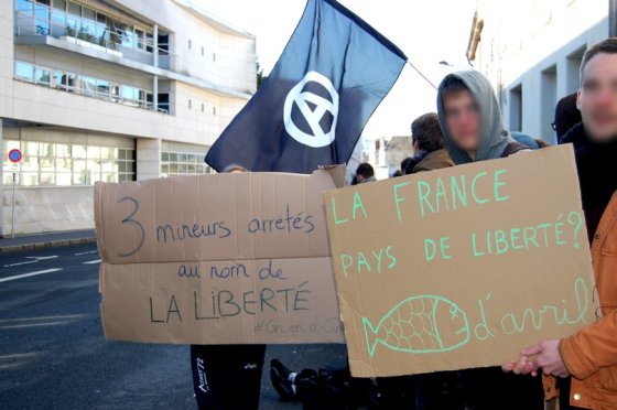 Ils sont à peu près soixante, essentiellement des lycéens ou étudiants mais aussi quelques adultes et représentants syndicaux, regroupés en face du commissariat depuis 9 h. « Nous sommes là en soutien à nos trois amis convoqués ce matin qui servent de bouc émissaire […] C’est de l’acharnement contre les jeunes. »