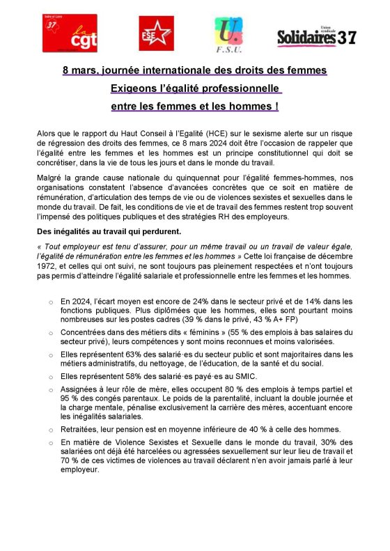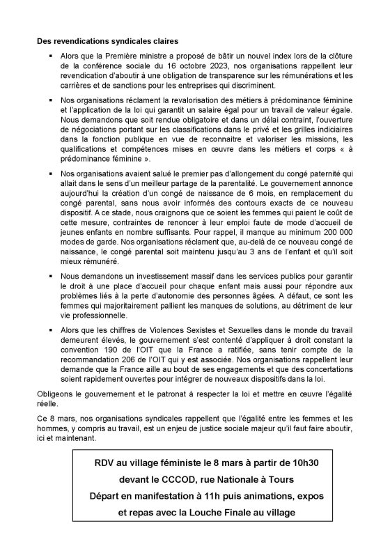 Manifestation 11h00 au départ du CCOD rue nationale à Tours puis village féministe avec animations, stands et repas avec La cantine militante La Louche Finale. Appels solidaires et unitaires ci-dessous