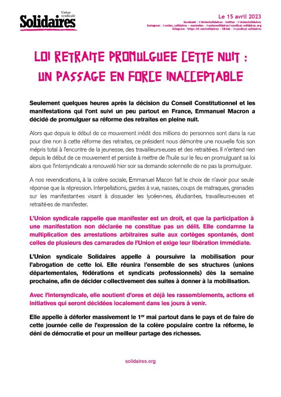 Alors que depuis le début de ce mouvement inédit des millions de personnes sont dans la rue pour dire non à cette réforme des retraites, ce président nous démontre une nouvelle fois son mépris total à l’encontre de la jeunesse, des travailleurs∙euses et des retraité∙es. Il n’entend rien depuis le début de ce mouvement et persiste à mettre de l’huile sur le feu en promulguant sa loi alors que l’intersyndicale a renouvelé hier soir sa demande solennelle de ne pas la promulguer.