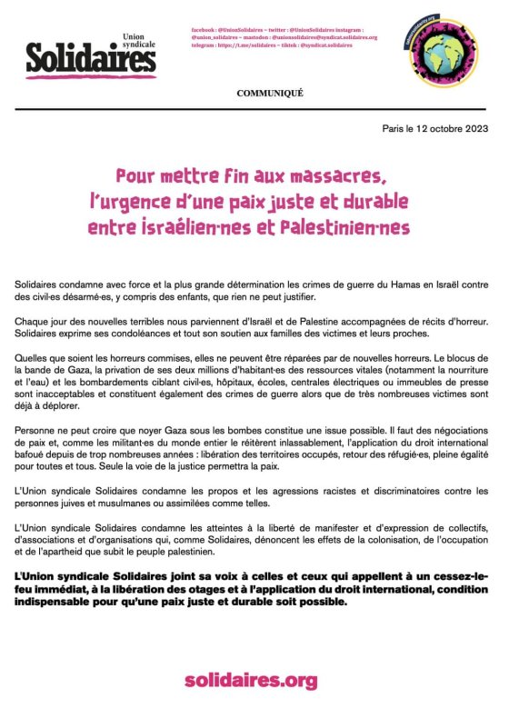Nous condamnons les crimes de guerre commis par des commandos du Hamas contre des civils israĂ©liens, crimes qui ont coĂ»tĂ© la vie Ă plus de 1400 personnes dont des centaines de femmes et dâenfants. Comme tout peuple opprimĂ©, le peuple palestinien a le droit de rĂ©sister, mais rien ne peut justifier de tels actes.