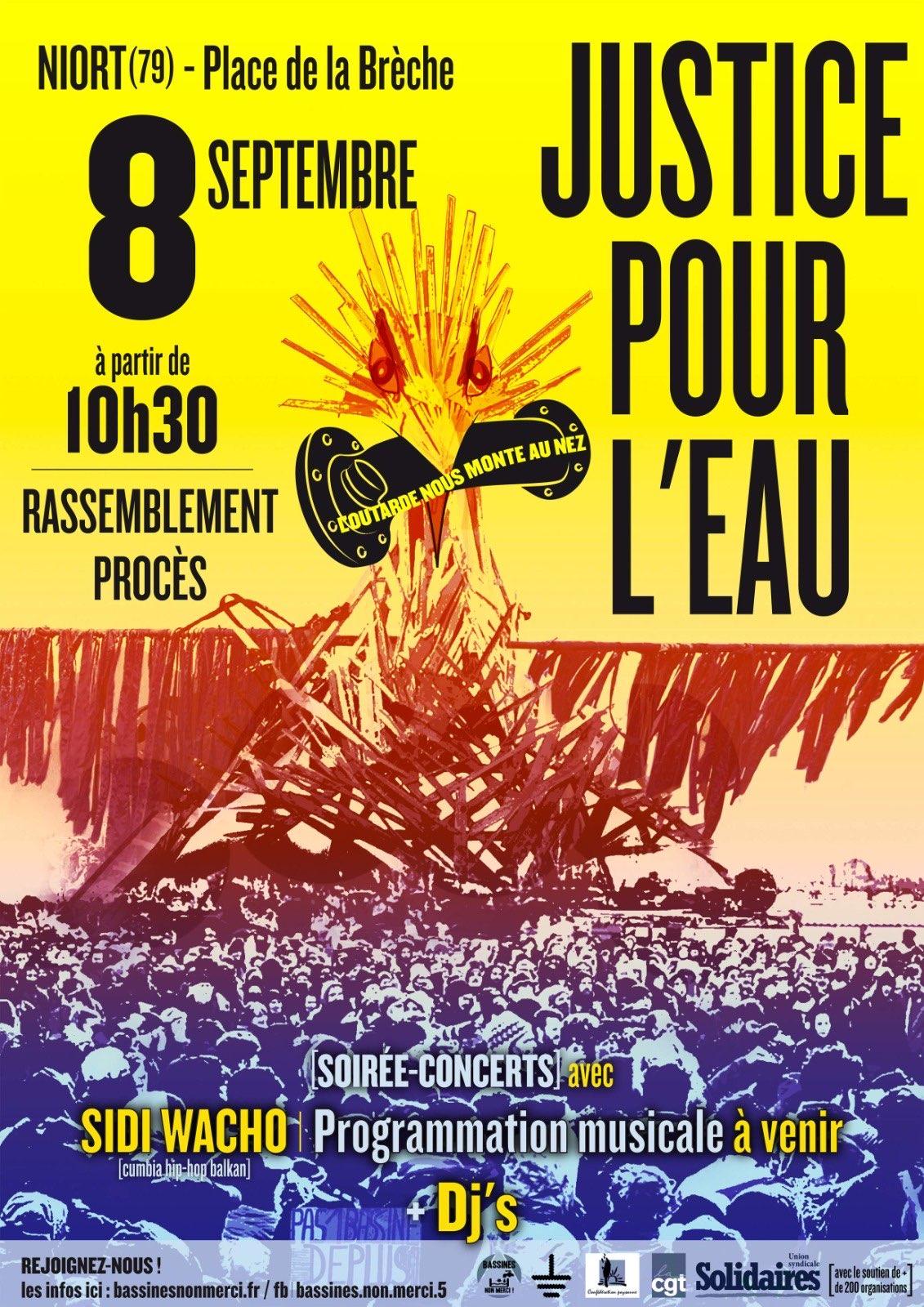 Le 8 septembre prochain, 9 personnes sont convoquĂ©es au tribunal de Niort pour des manifestations menĂ©es dans le cadre de la mobilisation contre les mĂ©ga-bassines et lâaccaparement de lâeau au profit du complexe agro-industriel. Ces procĂšs sâinscrivent dans un contexte de rĂ©pression croissante Ă lâencontre du mouvement pour la dĂ©fense de lâeau.