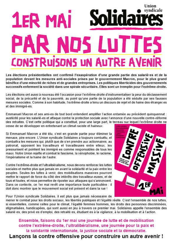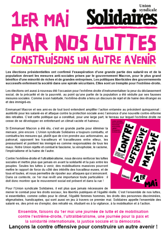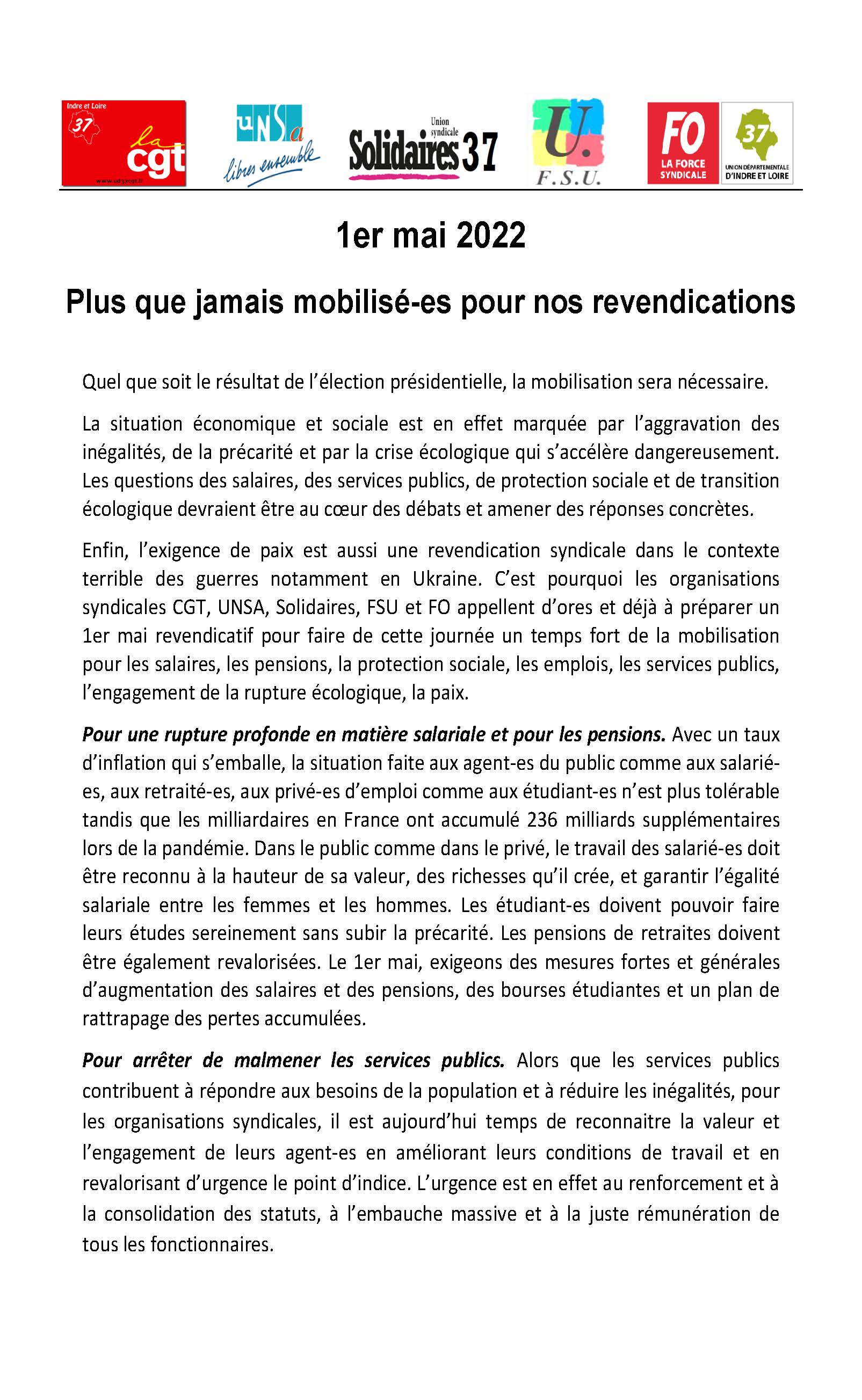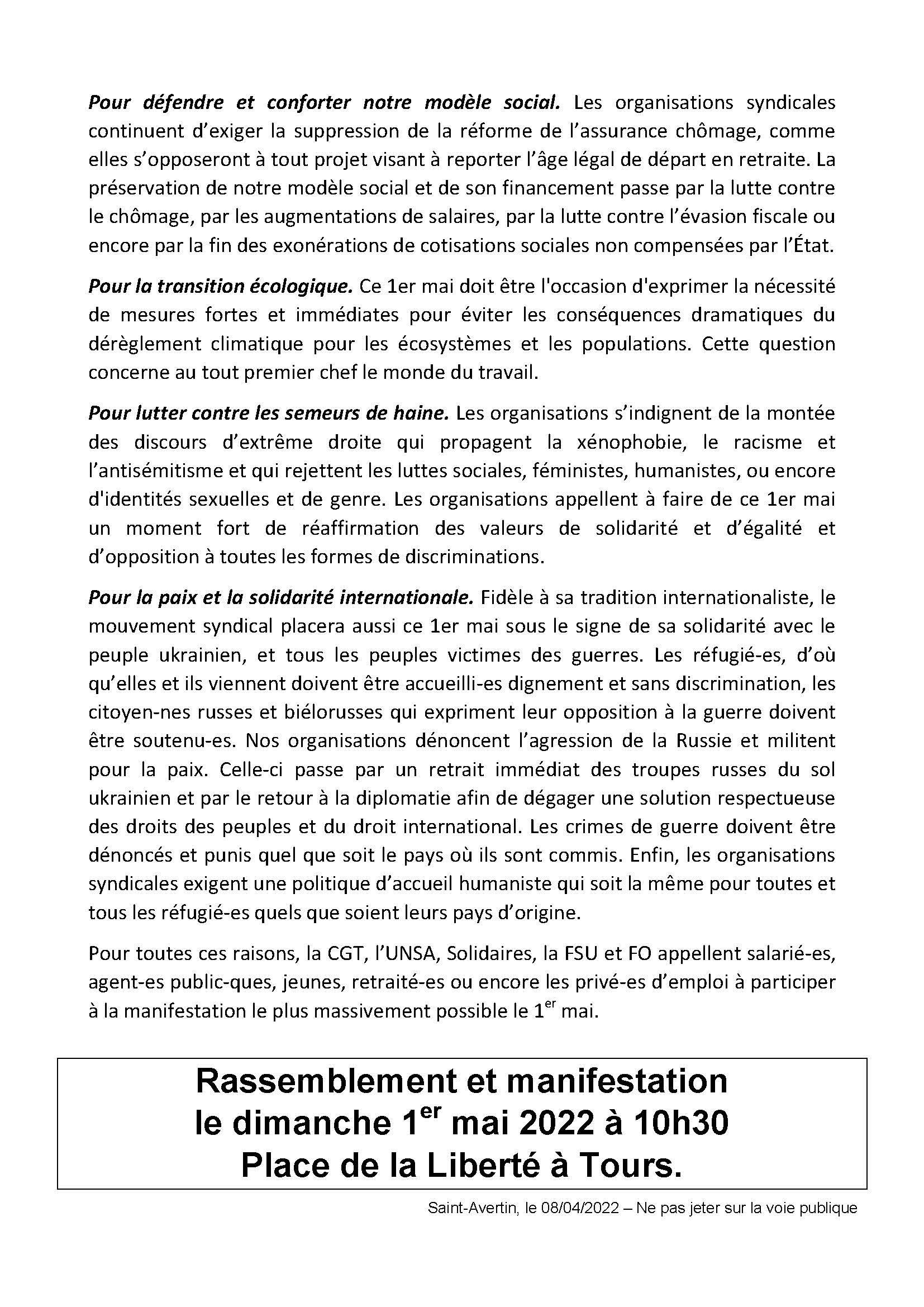 1er mai 2022 : manifestation intersyndicale 10h30 place de la liberté puis on continue avec Festiluttes place Anatole France avec forums, musique, pastilles culturelles et paella de loire !