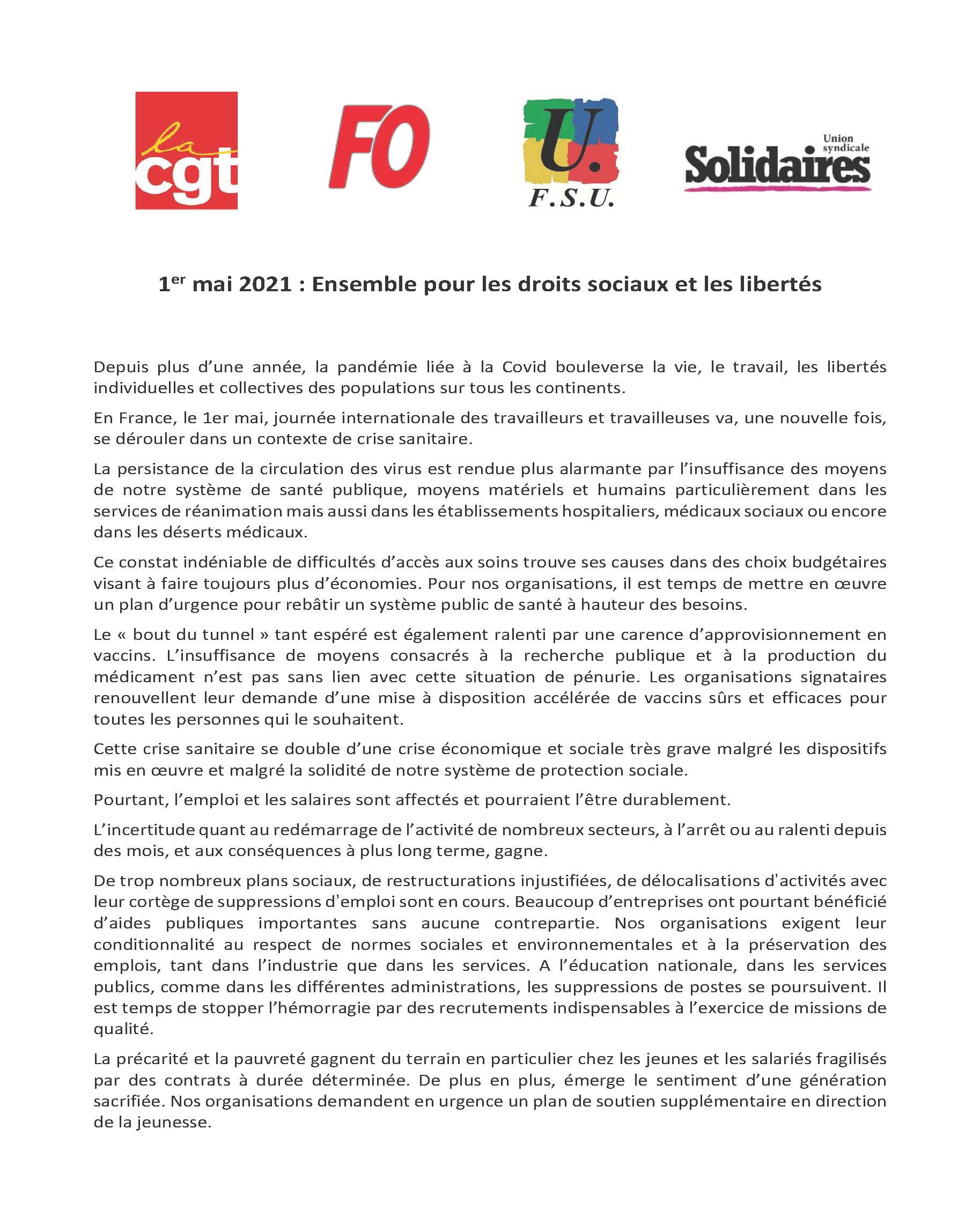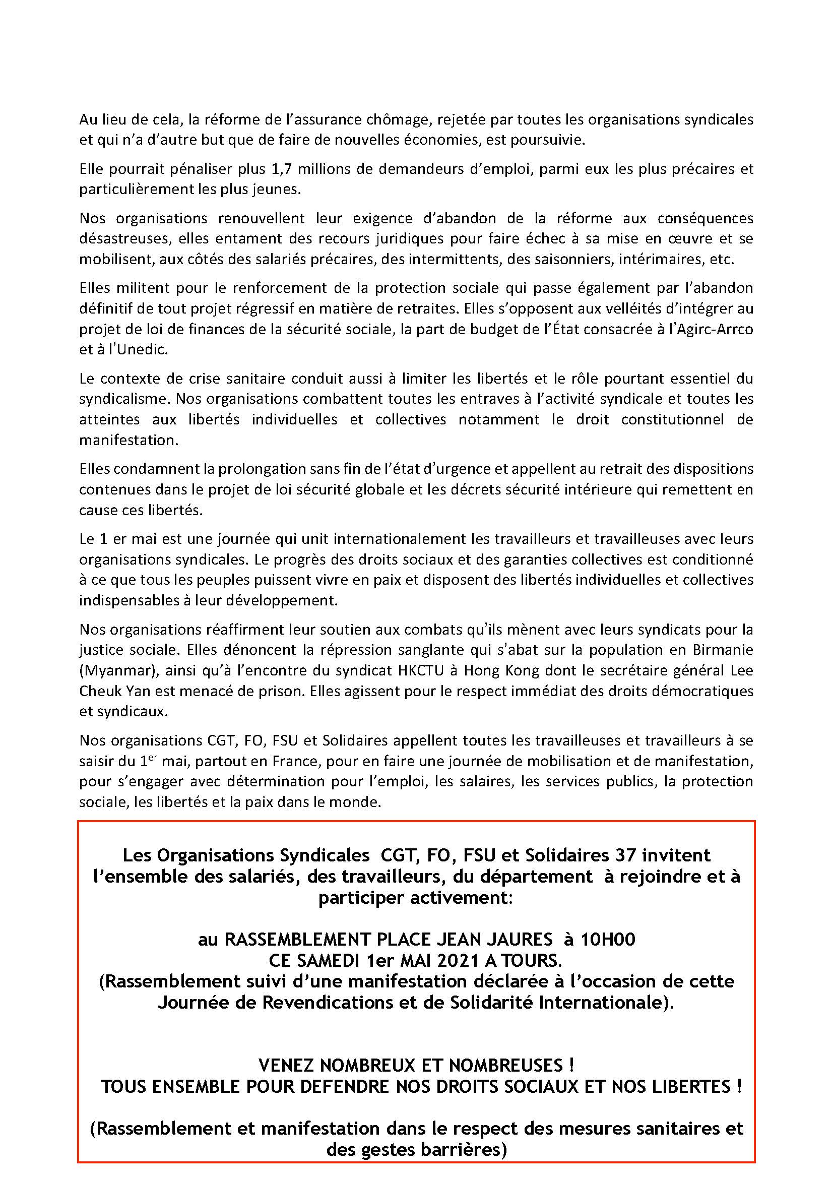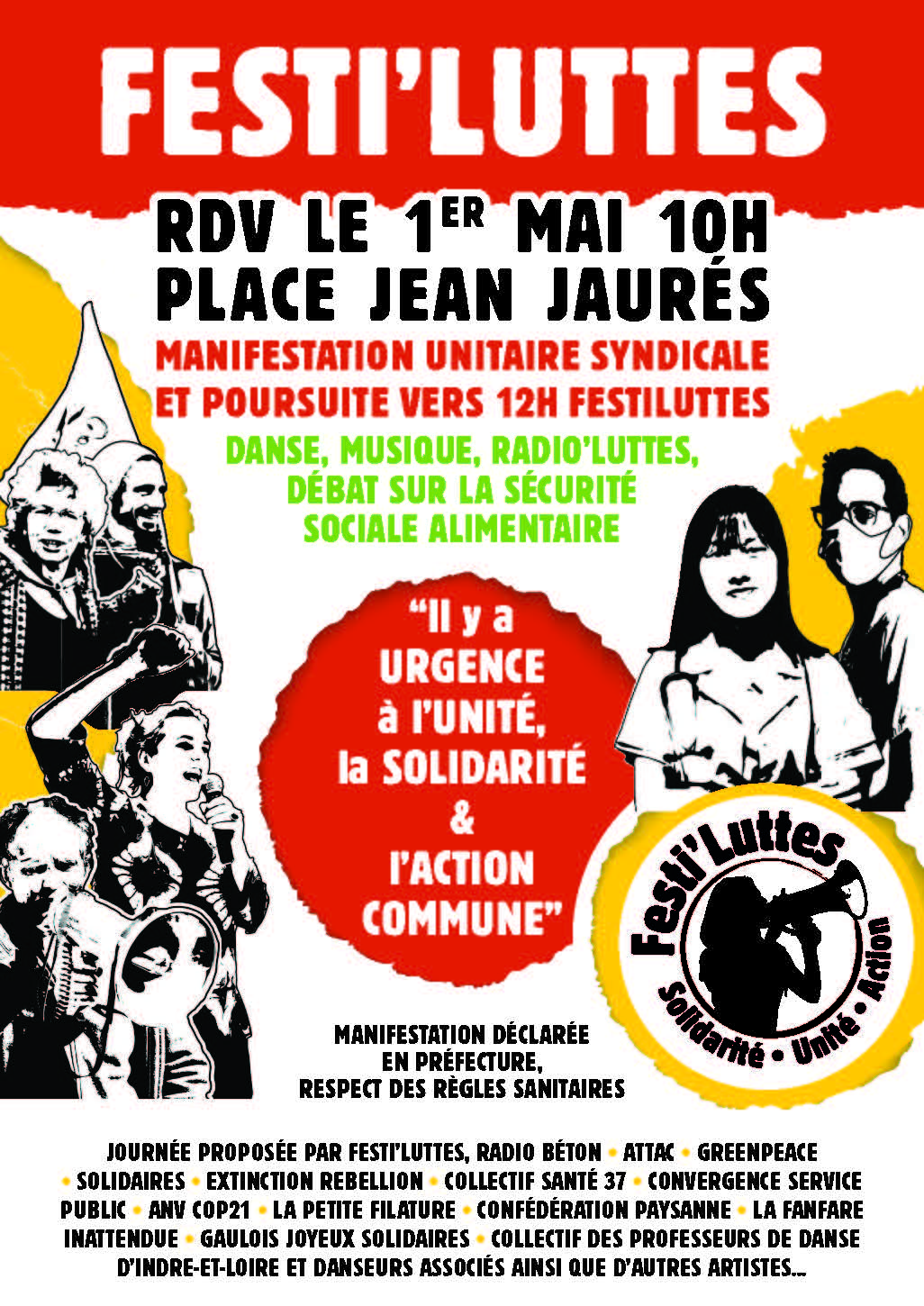 10h manifestation unitaire intersyndicale du 1er mai , puis à 12h00, parcours jusqu’au pont Wilson en musique et en dansant avec Festi’luttes, Radio Beton, Attac, Greenpeace, Solidaires, Extinction Rebellion, Collectif Santé 37, Convergence Service Public, ANV COP 21, La Petite Filature, La Confédération Paysanne, La Fanfare Inattendue, Les Gaulois Joyeux Solidaires, Chamblas, Le Collectif des Professeurs de Danse d’Indre et Loire et Danseurs Associés ainsi que d’autres collectifs et artistes... La journée va être longue, pensez à amener votre repas ! Manifestation déclarée en préfecture et dans le respect des gestes barrières. A samedi !!