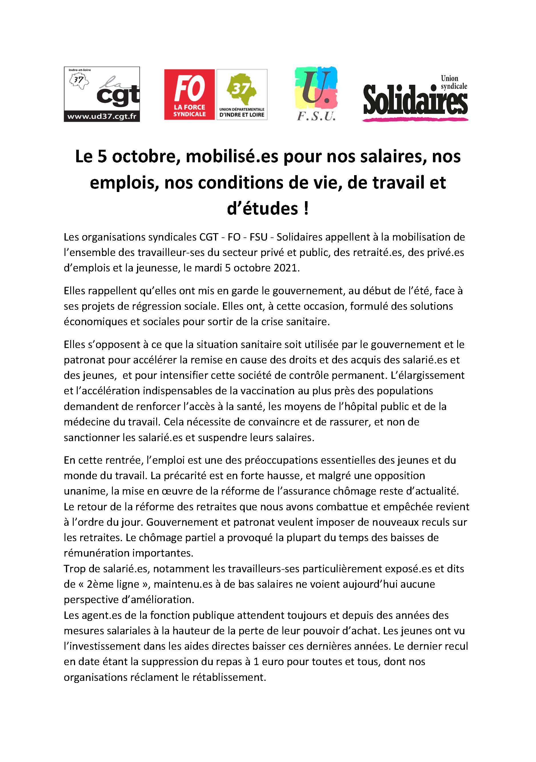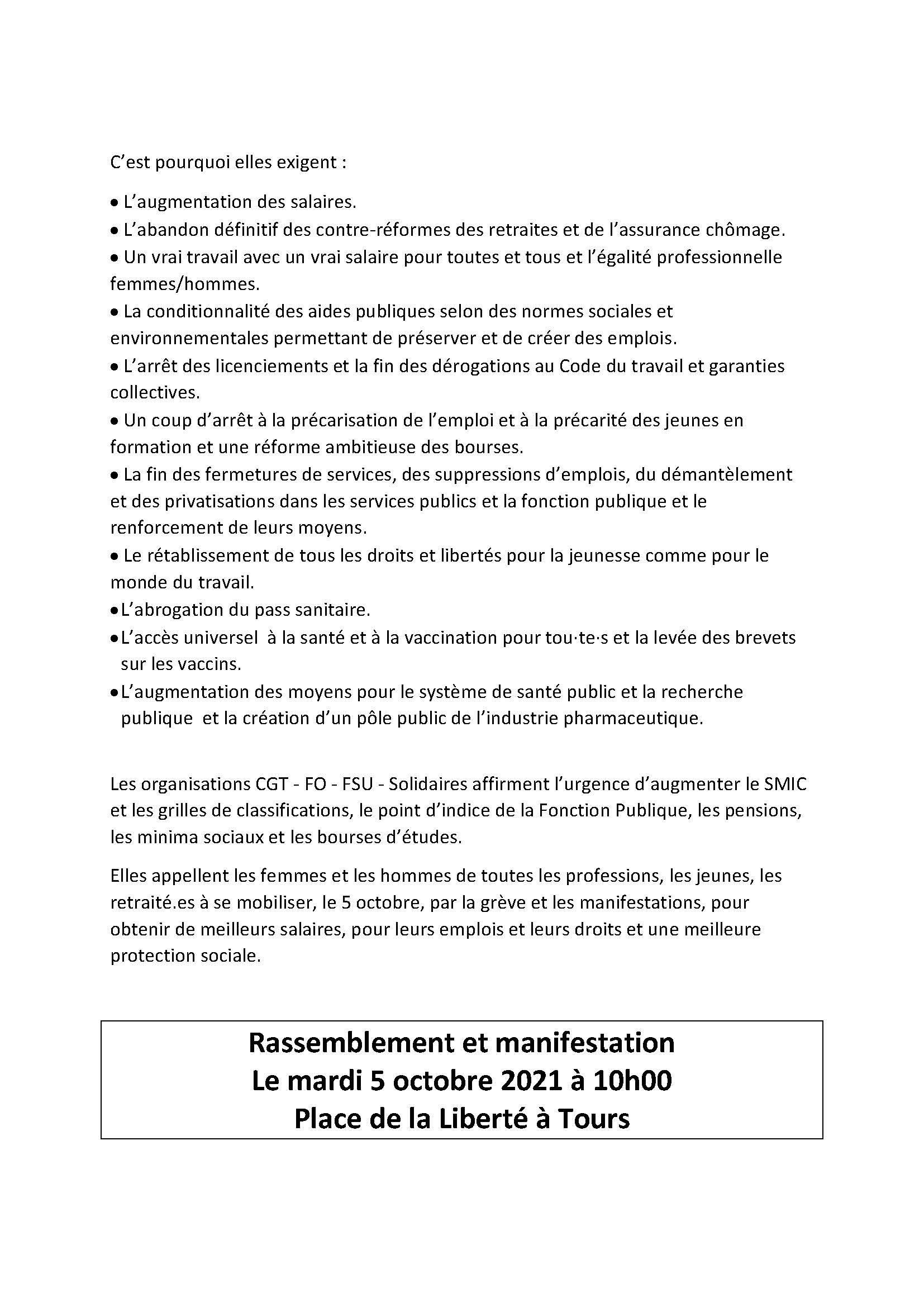 L’intersyndicale CGT, FO, FSU et Solidaires, ainsi que les organisations de jeunesse, appellent à la grève interprofessionnelle le mardi 5 octobre. Les raisons de se mobiliser sont nombreuses : L’augmentation des salaires et l’égalité professionnelle femmes/hommes. L’abandon définitif des contre-réformes des retraites et de l’assurance chômage. L’arrêt des licenciements et de la précarisation de l’emploi. Le rétablissement de tous les droits et libertés pour la jeunesse comme pour le monde du travail. L’abrogation du pass sanitaire, de son obligation vaccinale et des sanctions envers les salarié-es. L’accès universel à la santé et à la vaccination pour tou·te·s et la levée des brevets sur les vaccins. L’augmentation des moyens pour le système de santé public et la recherche publique et la socialisation de l’industrie pharmaceutique. RDV A 10H, MARDI 5 OCTOBRE, PLACE DE LA LIBERTE A TOURS