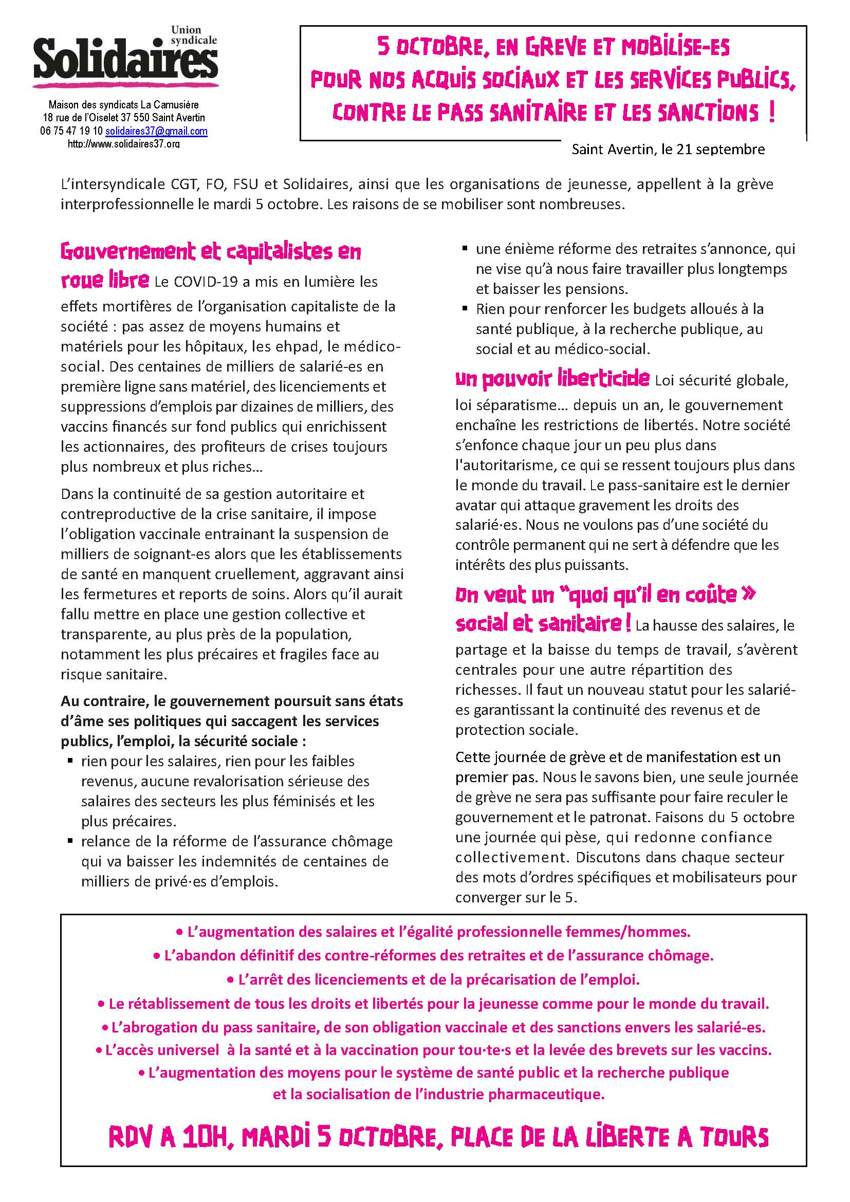 5 OCTOBRE, EN GREVE ET MOBILISE-ES POUR NOS ACQUIS SOCIAUX ET LES SERVICES PUBLICS, CONTRE LE PASS SANITAIRE ET LES SANCTIONS !