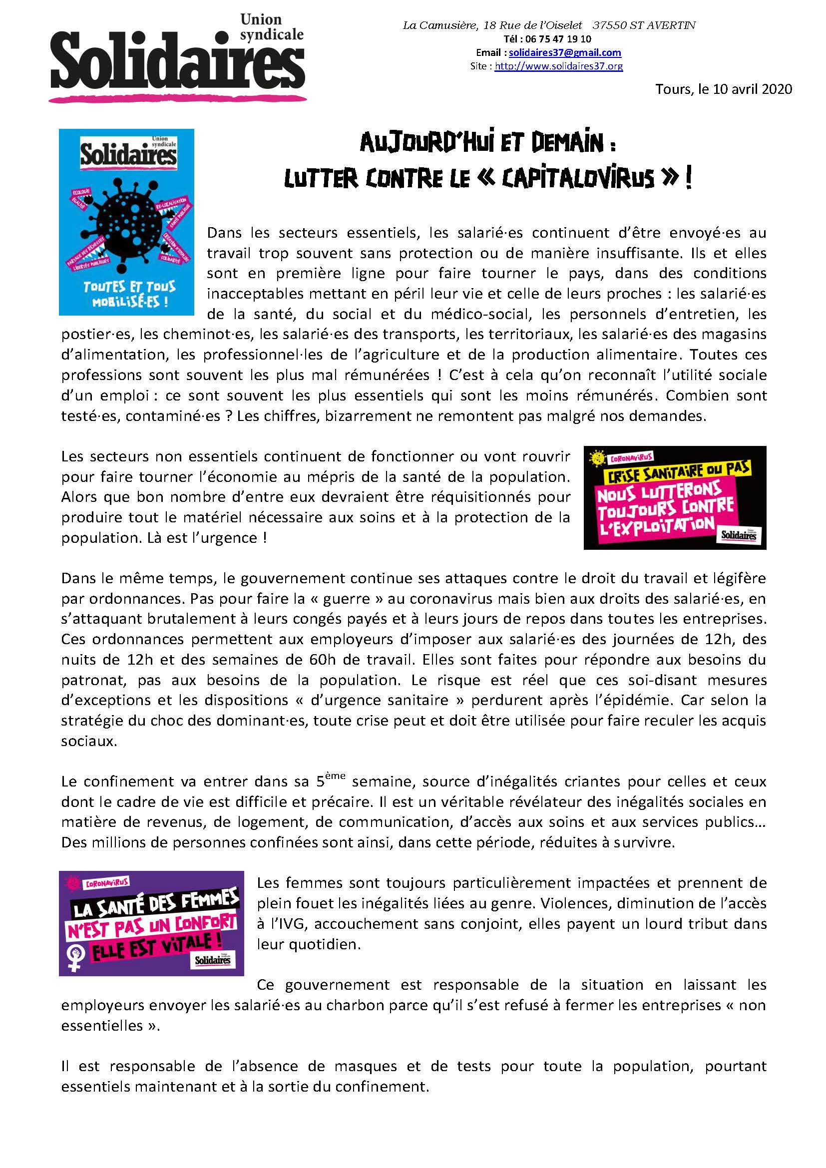 Solidaires est présent dans cette crise sans précédent, un numéro vert a été mis en place pour répondre aux besoins des salarié•es, géré par des syndicalistes de plusieurs secteurs. C’est le 0 805 37 21 34. Et nous serons aussi là, à la sortie de cette crise sanitaire, pour reprendre et amplifier les luttes, plus que jamais aux côtés de celles et ceux qui lutteront pour imposer un autre avenir, pour en finir avec ce système d’exploitation et de destruction des biens communs. Ce ne sera pas à nous de payer cette crise. Nos vies valent plus que leurs profits !