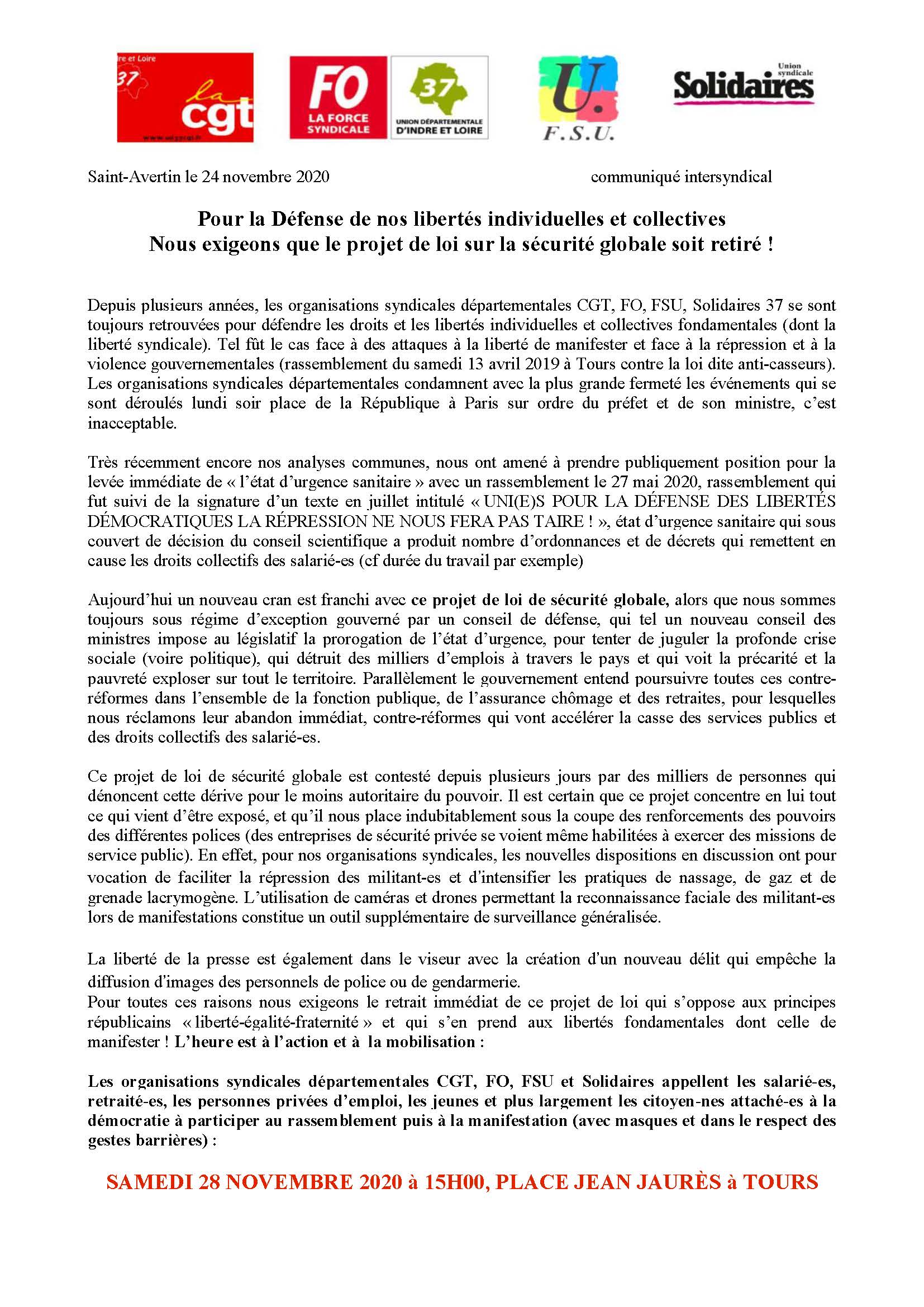 Appel intersyndical manifestation 28 novembre 15h place Jean Jaurès