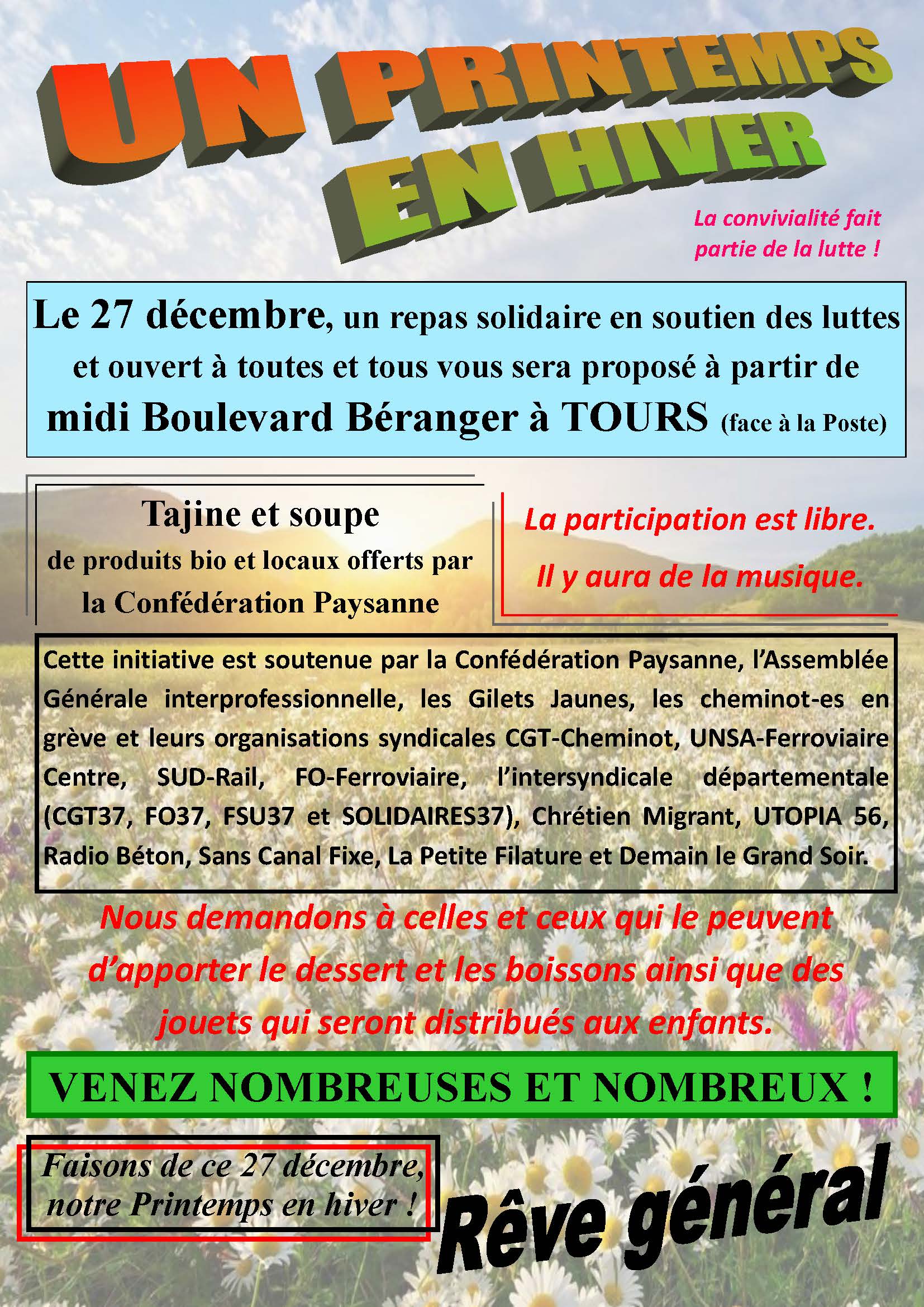 Le 27 décembre, un repas solidaire en soutien des luttes et en direction des plus défavorisé-es vous sera proposé à partir de midi Boulevard Béranger à TOURS.
