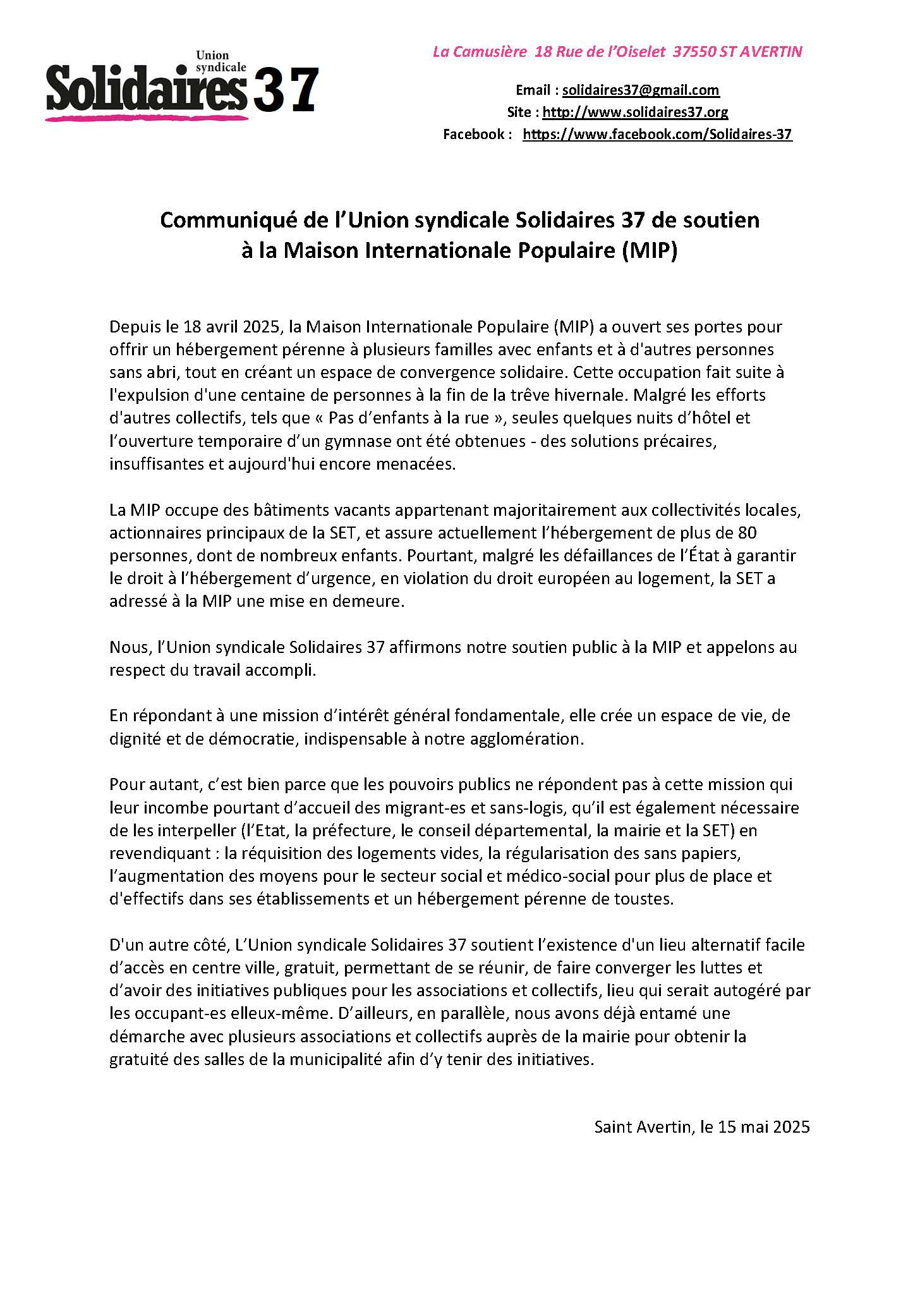 Communiqué de l’Union syndicale Solidaires 37 de soutien à la Maison Internationale Populaire (MIP)