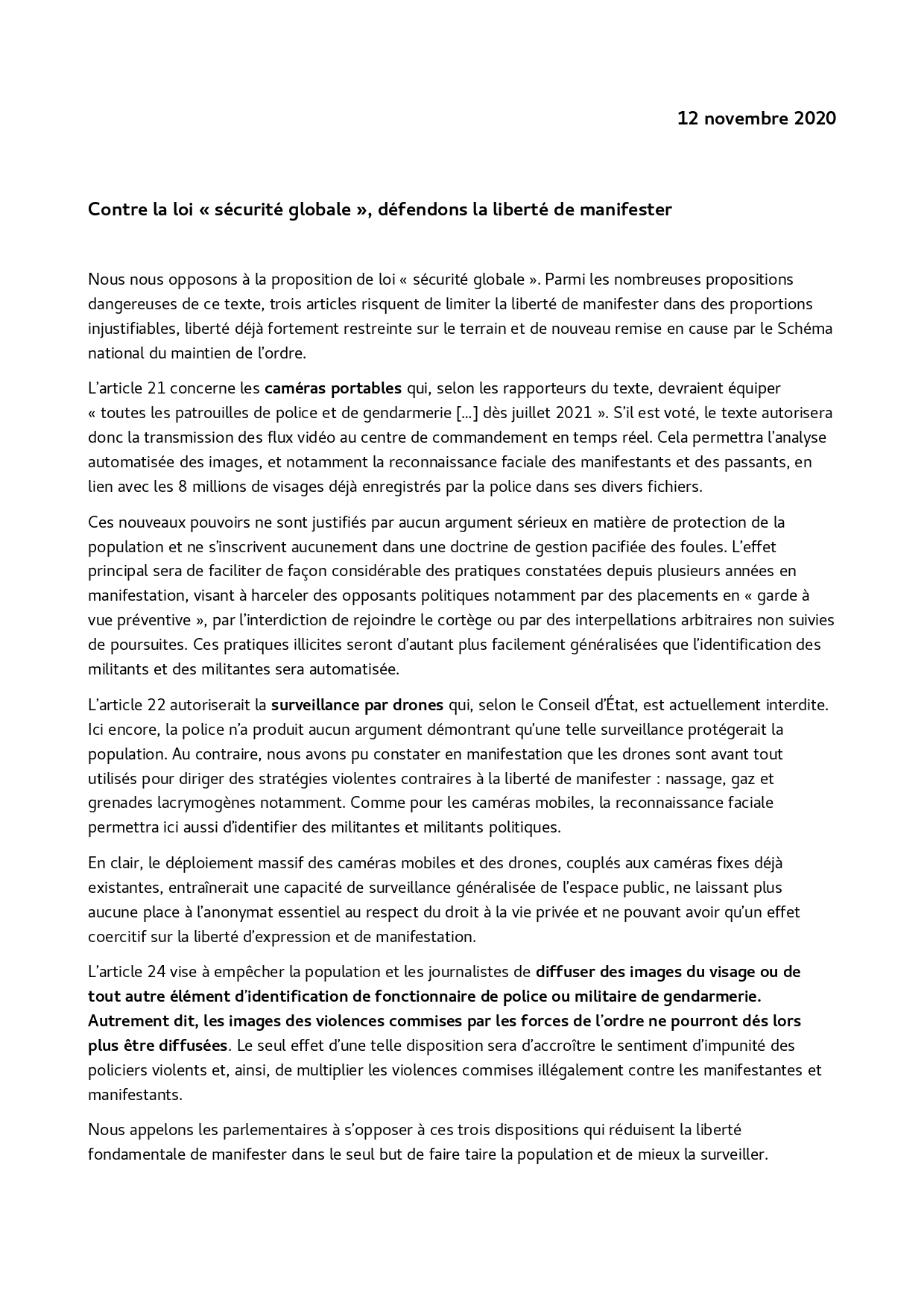 Contre la loi « sécurité globale », défendons la liberté de manifester