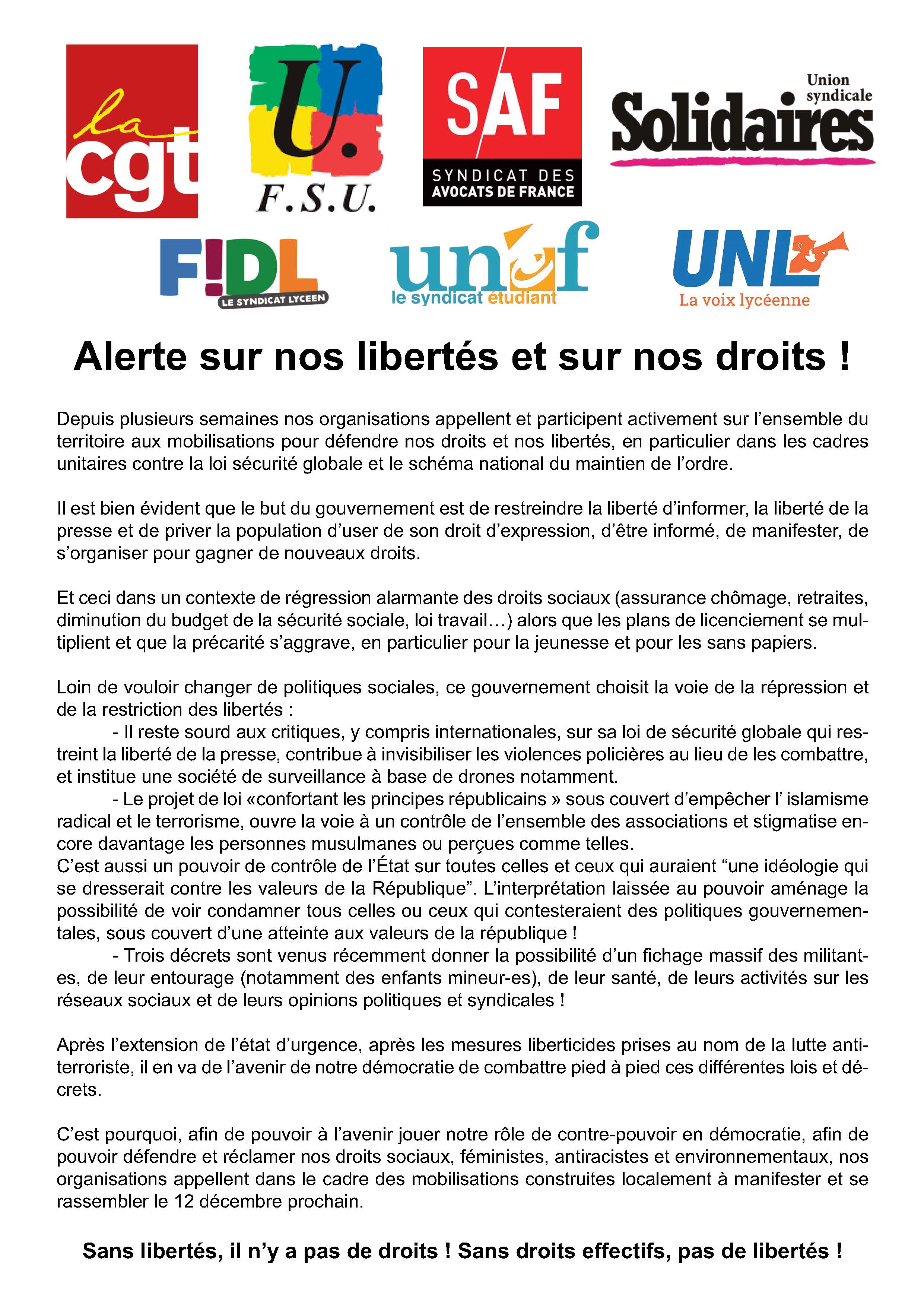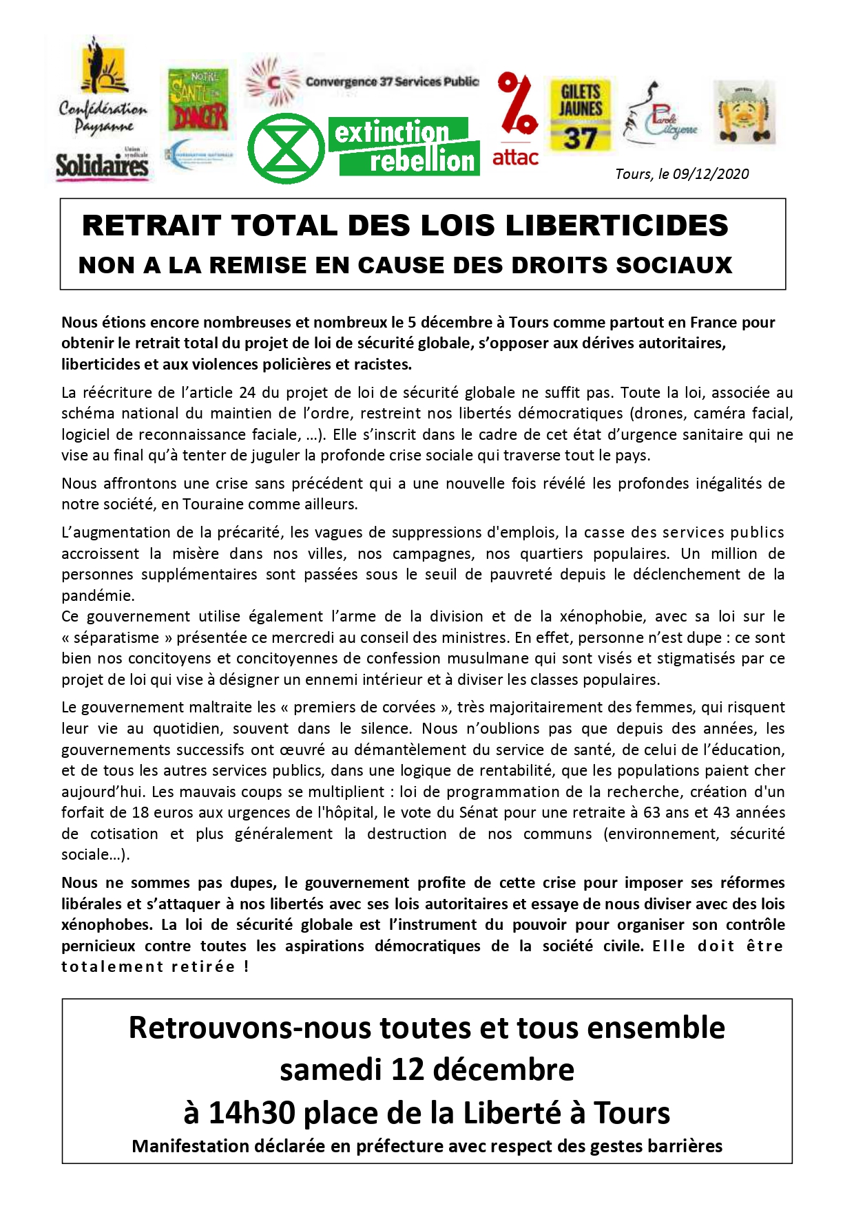 Contre la loi "sécurité globale" et les lois liberticides, pour la défense des droits sociaux, toutes et tous ensemble le samedi 12 décembre à 14h30 Place de la Liberté à Tours !