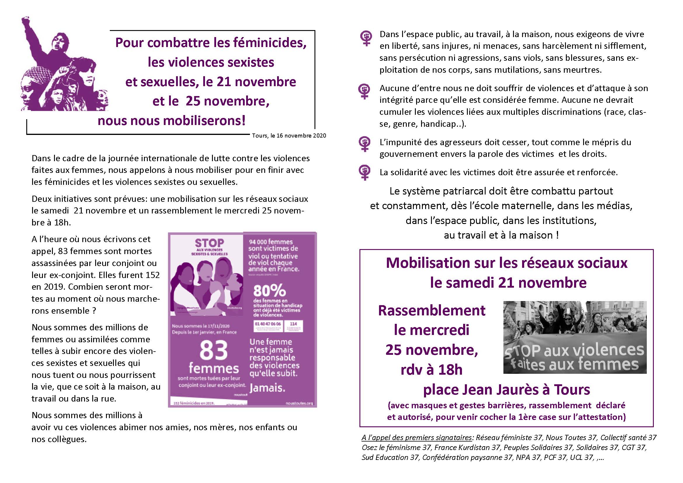 25 novembre 2022, journée internationale de luttes contre les violences faites aux femmes ! Manifestation unitaire 18h place Jean Jaurès à Tours !