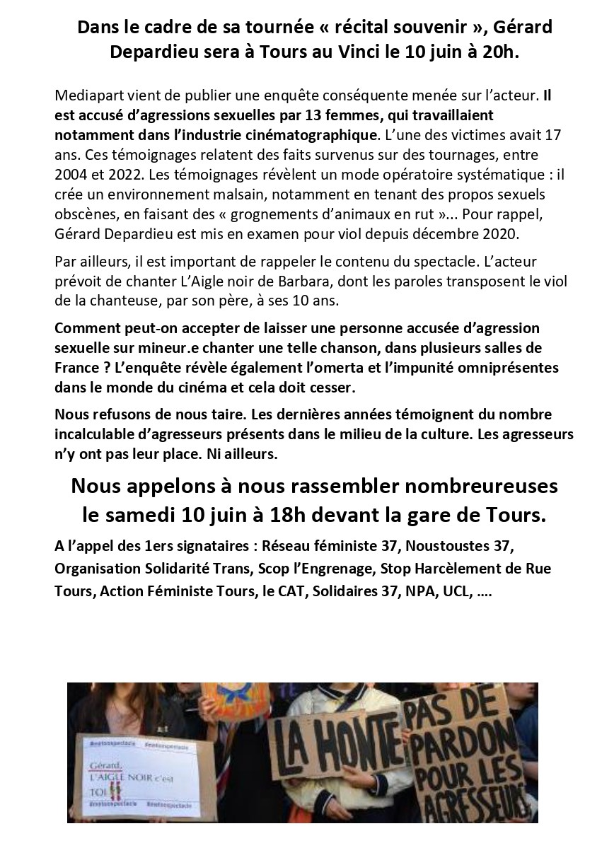 Gérard Depardieu au Vinci à Tours le 10 juin ! Nous ne pouvons laisser faire ! RDV à 18h devant la gare ! Stop à l’impunité ! Appel unitaire ci dessous