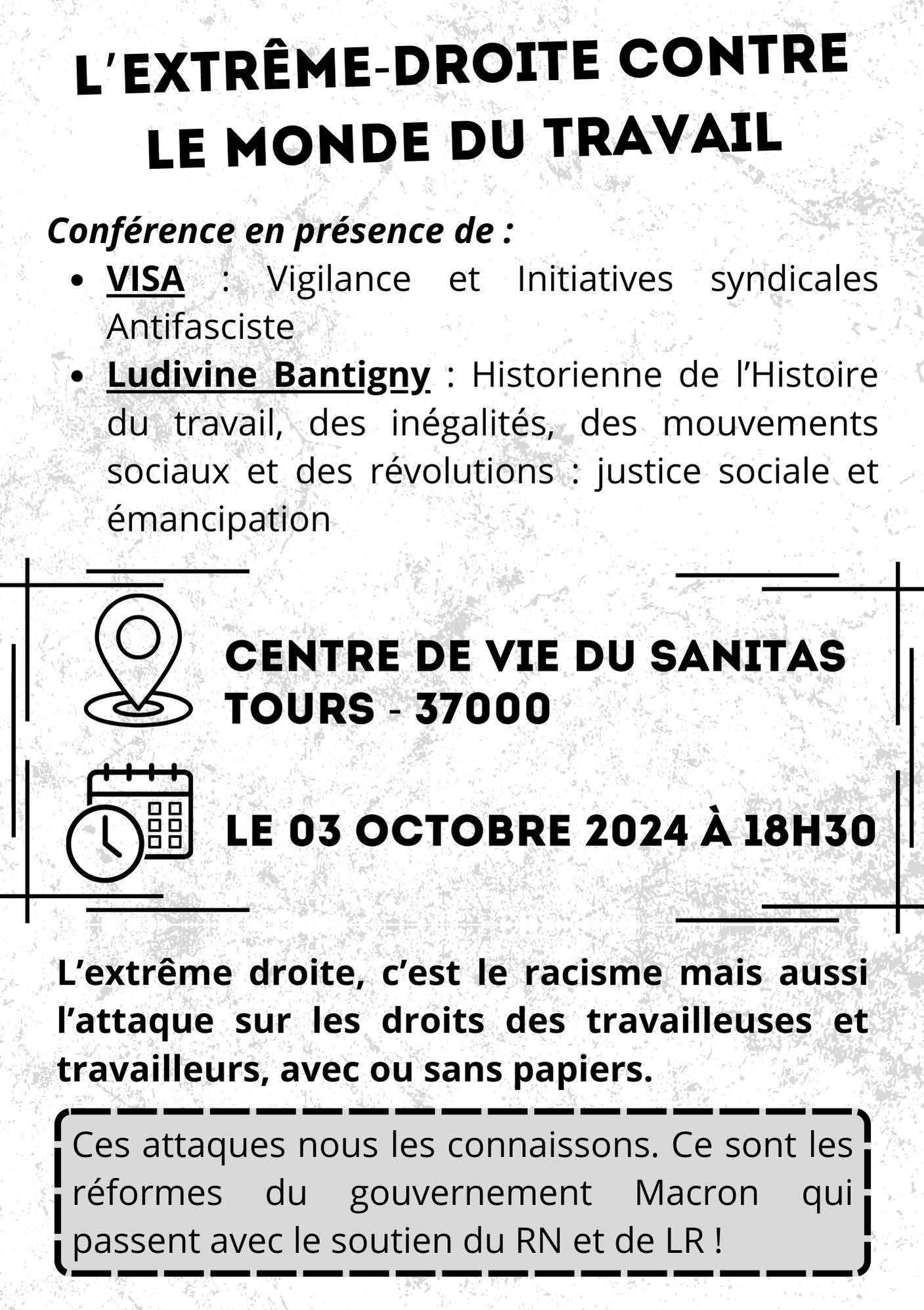 Invitation conférence jeudi 3 octobre 18h30 "L’extrême droite contre le monde du travail" en présence de VISA et Ludivine Bantigny Centre de vie du Sanitas place neuve à Tours