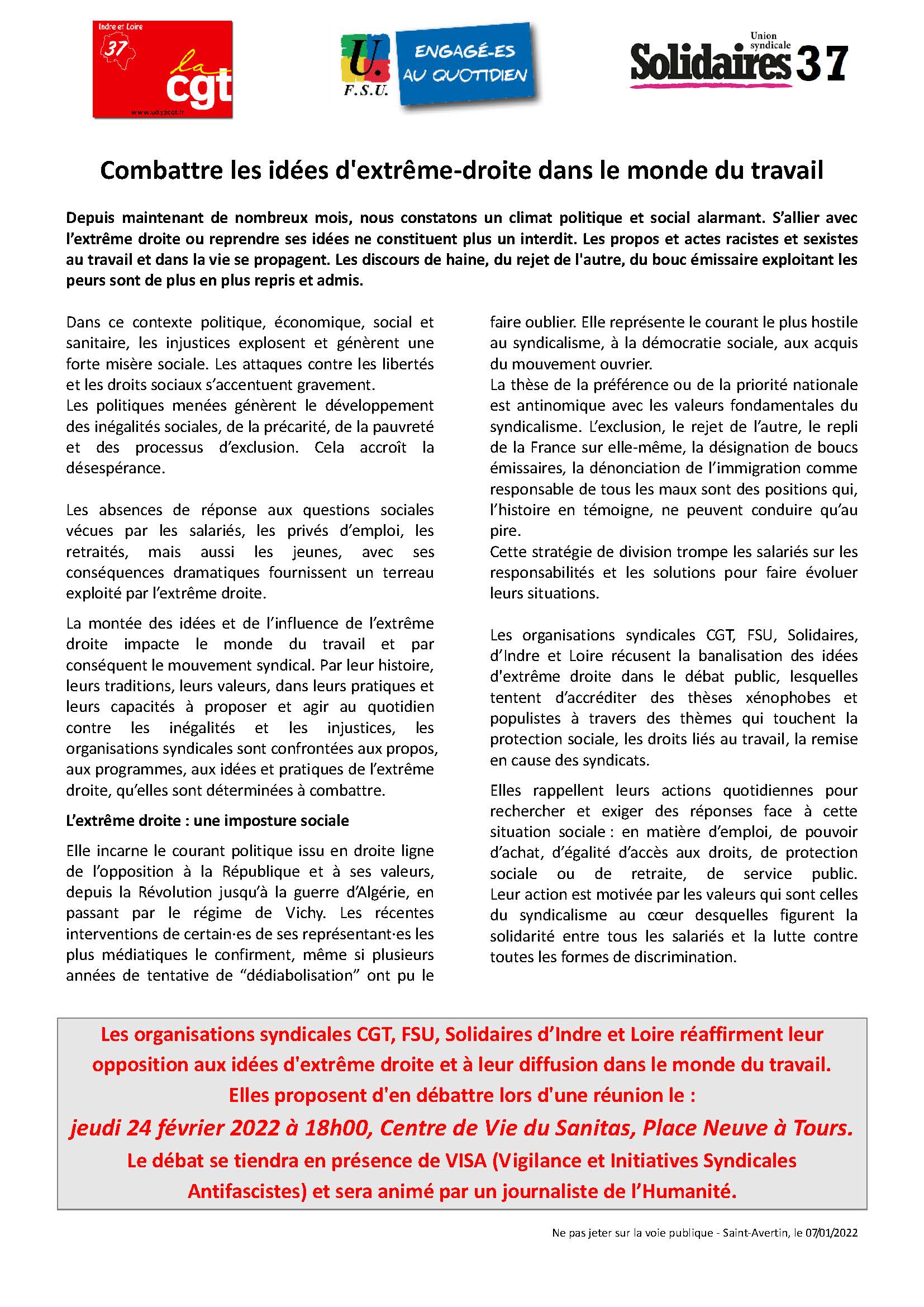 Débat intersyndical CGT, FSU et Solidaires, en présence de VISA, le jeudi 24 février à 18h au Centre de vie du sanitas, place neuve à Tours. Appel unitaire ci-dessous