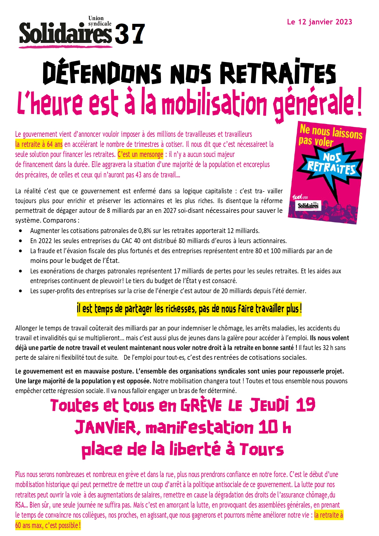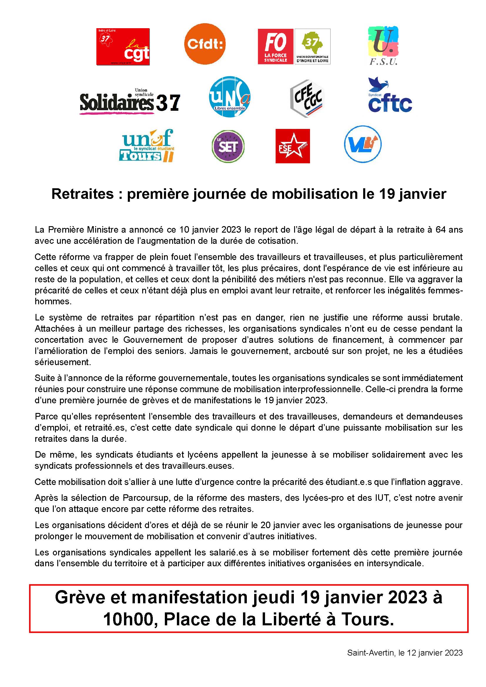 La bataille des retraites est lancée ! Toutes et tous en grève le 19 janvier ! Manifestation à 10h place de la Liberté à Tours !