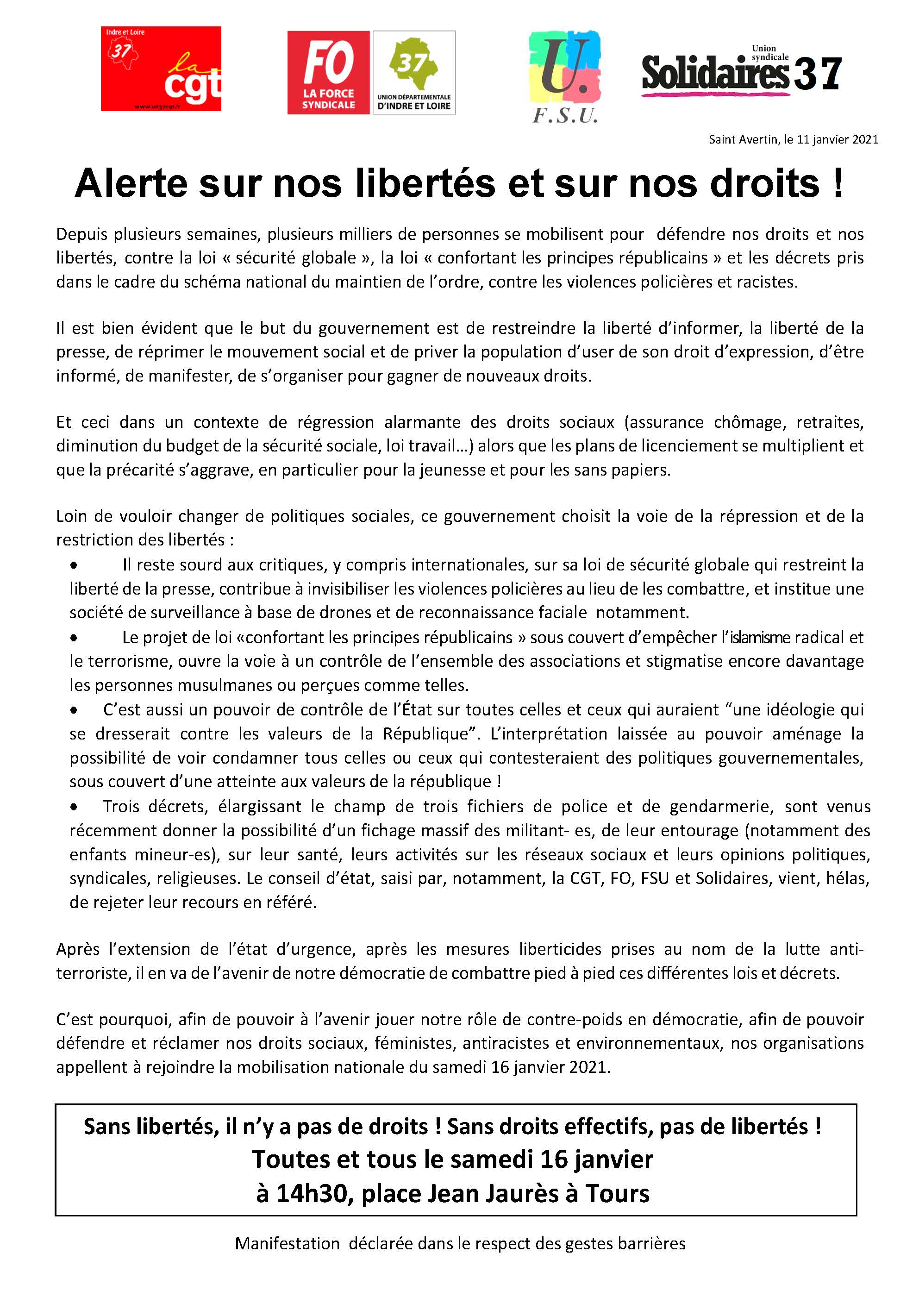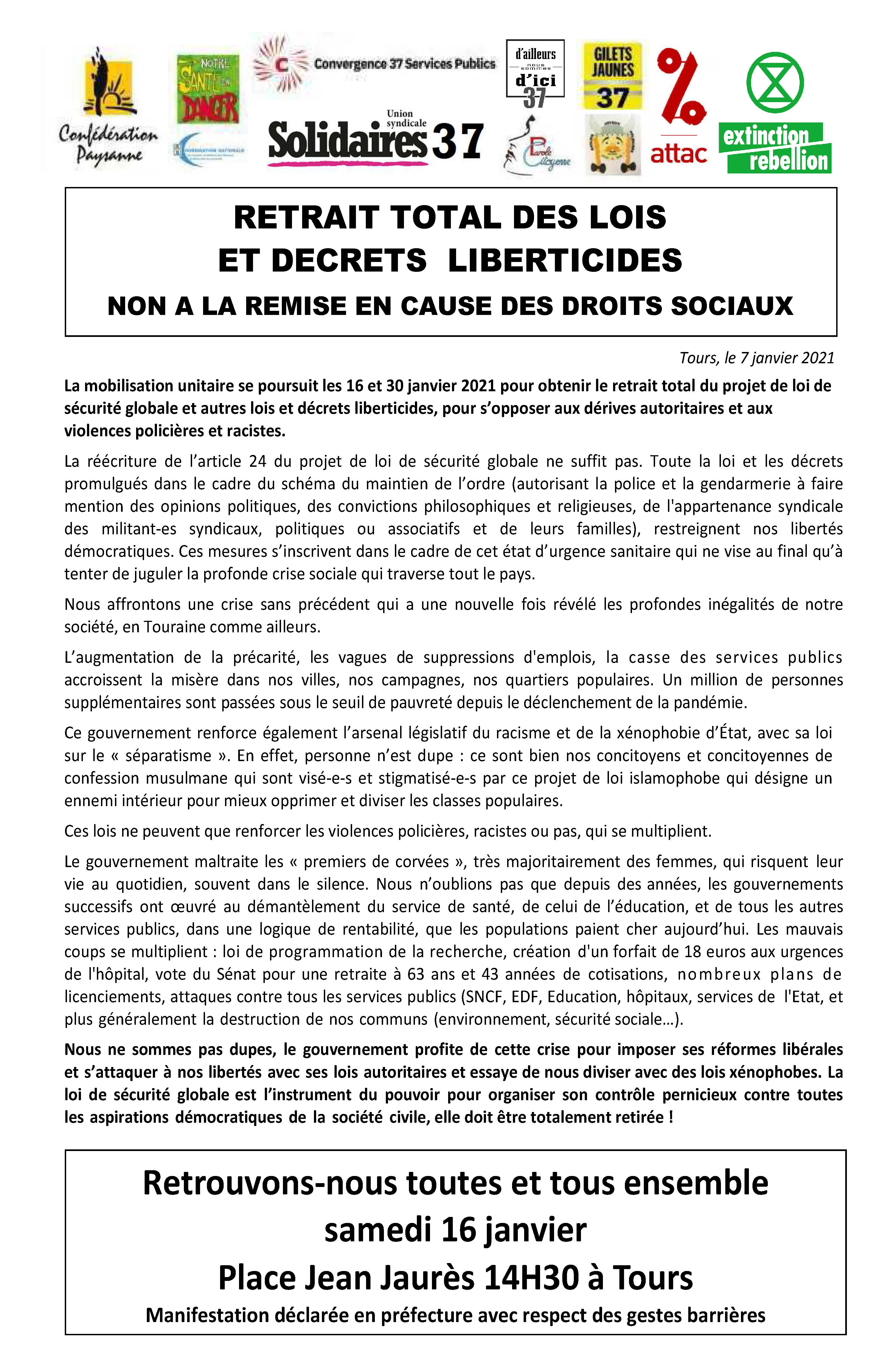 La mobilisation contre les lois liberticides se poursuit ! RDV samedi 16 janvier à 14h30 place Jean Jaurès à Tours !