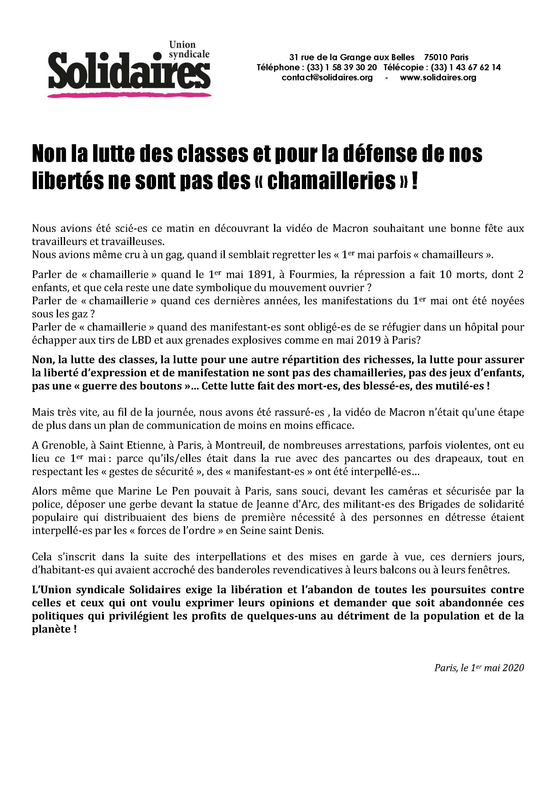 Le 1er mai dans la région, non la lutte des classes et pour la défense de nos libertés ne sont pas des « chamailleries » !