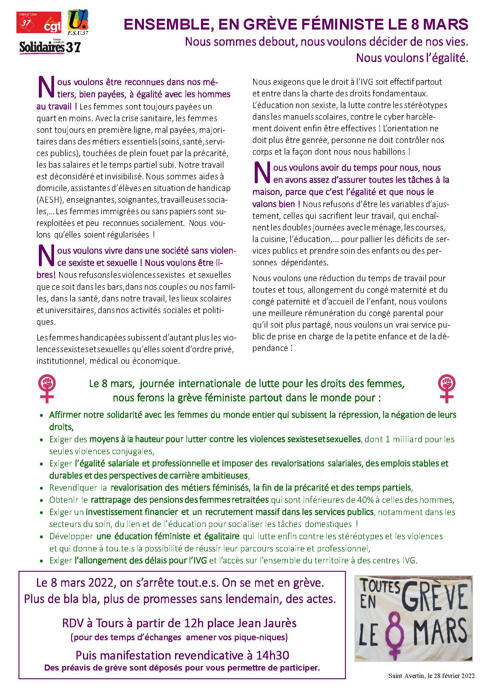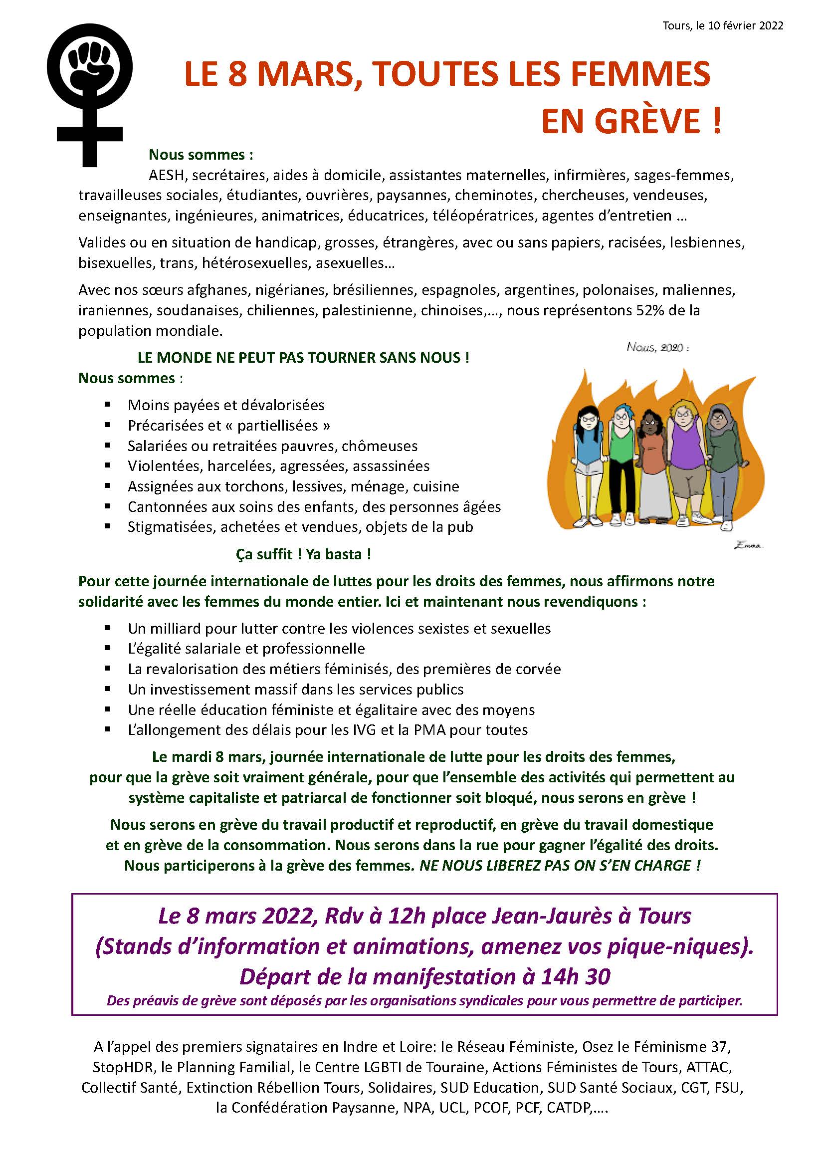 Les femmes s’arrètent, tout s’arrète ! Stands d’informations à partir de 12h place Jean jaurès à Tours puis manifestation à 14h30 !Tract intersyndicale féministe, tract unitaire large et visuel ci-dessous