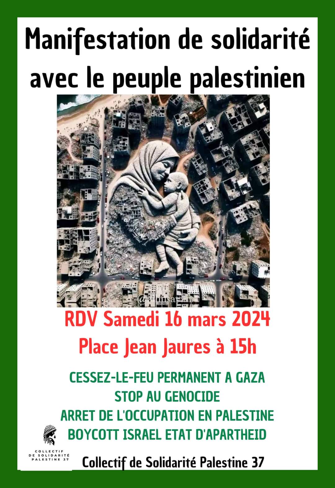 Manifestation de soutien à la Palestine samedi 16 mars à 15h place Jean Jaurès à Tours