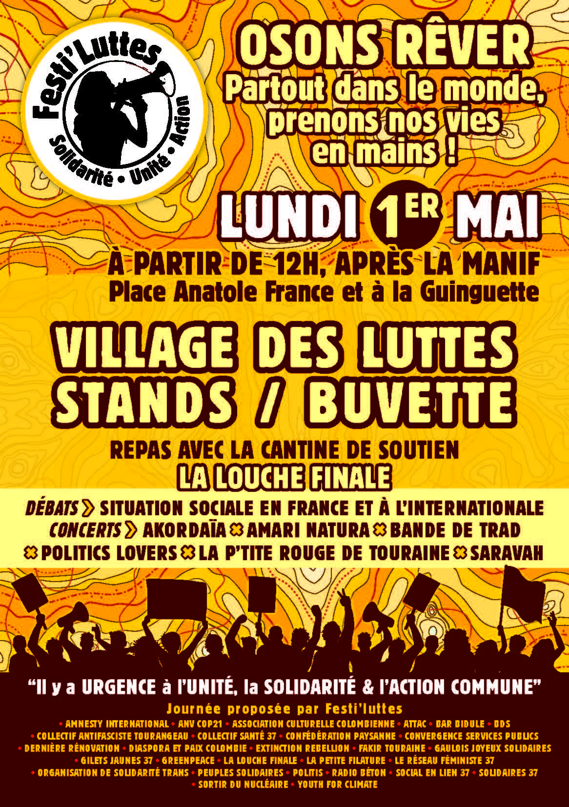 Nous poursuivrons ensuite avec l’ensemble des organisations du collectif festi’luttes place Anatole France et à la guinguette de Tours à partir de 12h pour une fête populaire avec des stands, des débats, de la musique, de la danse et des concerts. La Louche Finale propose un repas le midi.