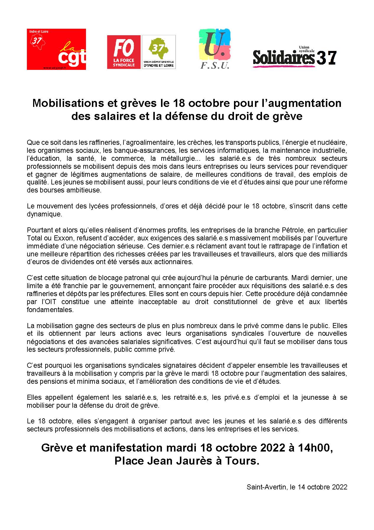 Pour nos salaires, le 18 octobre, EN GRÈVE et en Assemblées Générales de reconduction partout où c’est possible ! Manifestation 14h place Jean Jaurès ! C’est le moment d’y aller toutes et tous ensemble et d’imposer des augmentations généralisées !