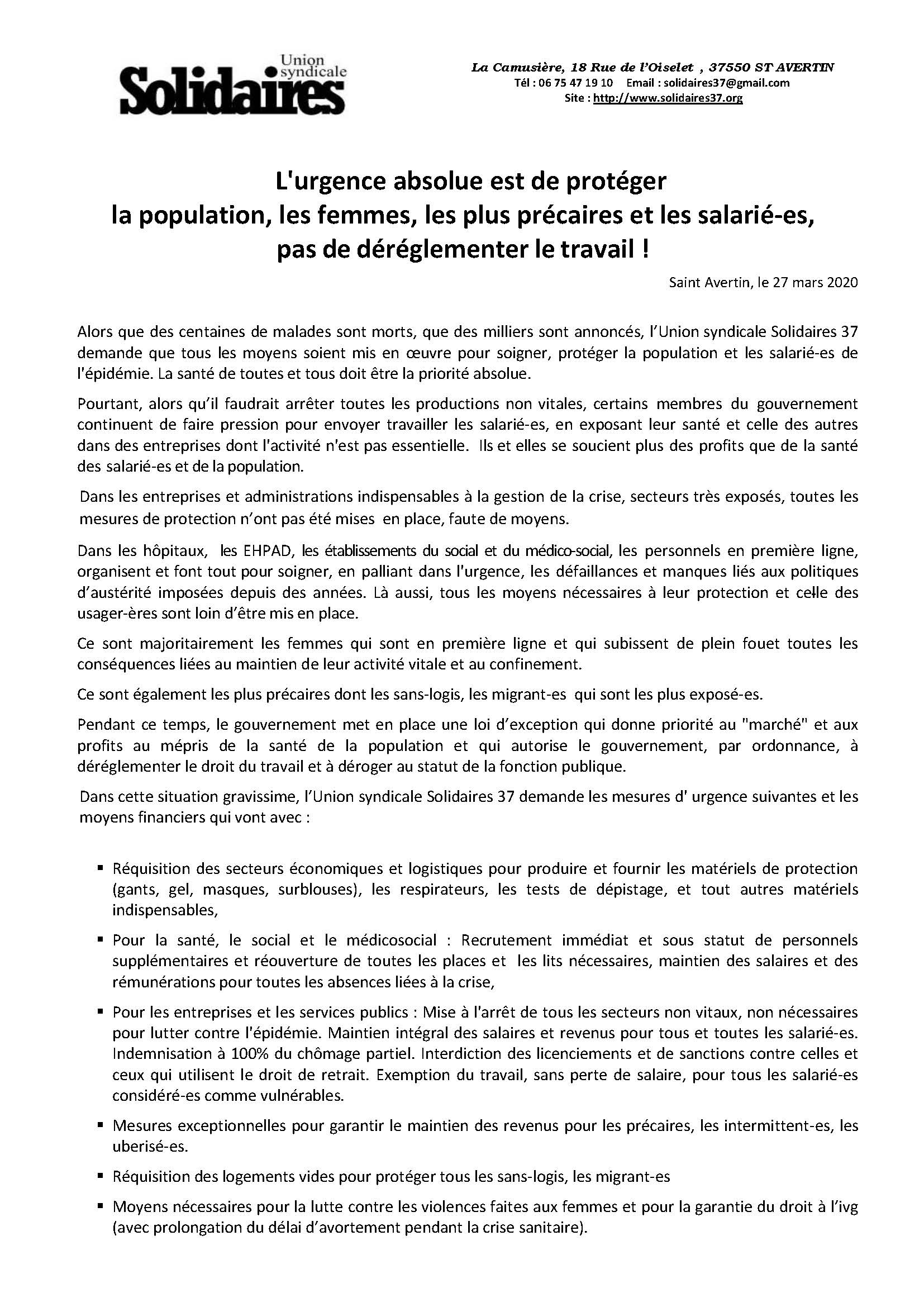 Solidaires 37 demande les mesures d’ urgence suivantes et les moyens financiers qui vont avec :