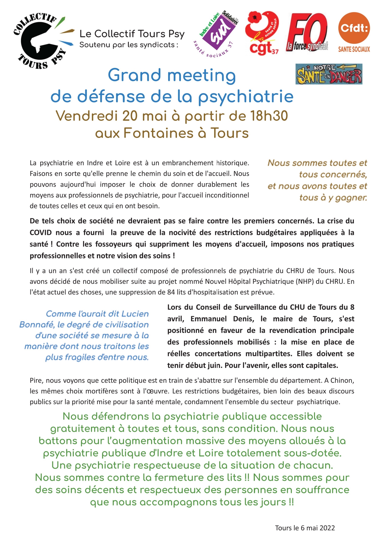 Quel avenir pour la psychiatrie en Indre et Loire ? réunion publique le vendredi 20 mai à 18h30 Salle Villeret aux Fontaines, 11 rue de Saussure