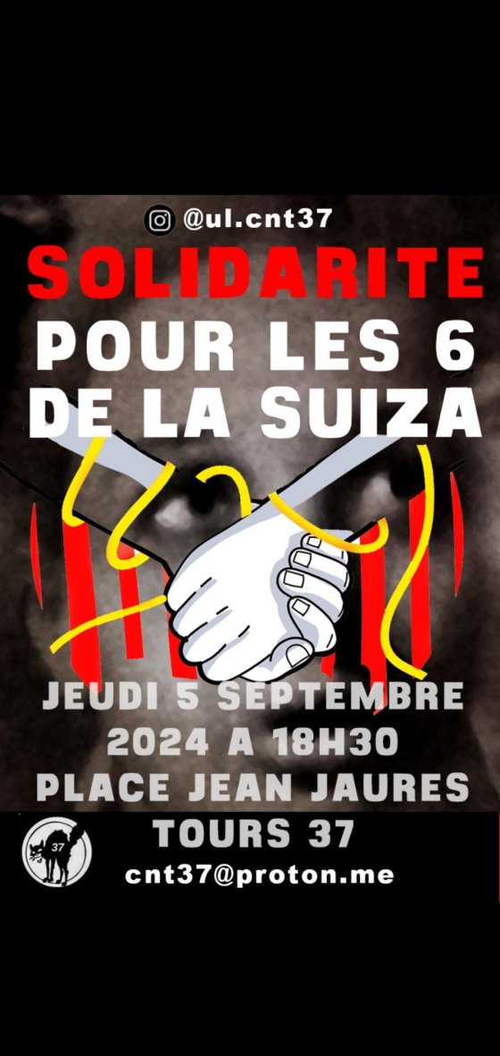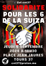 Solidarité avec les 6 de la Suiza, rassemblement jeudi 5 septembre 18h30 place Jean jaurès à Tours