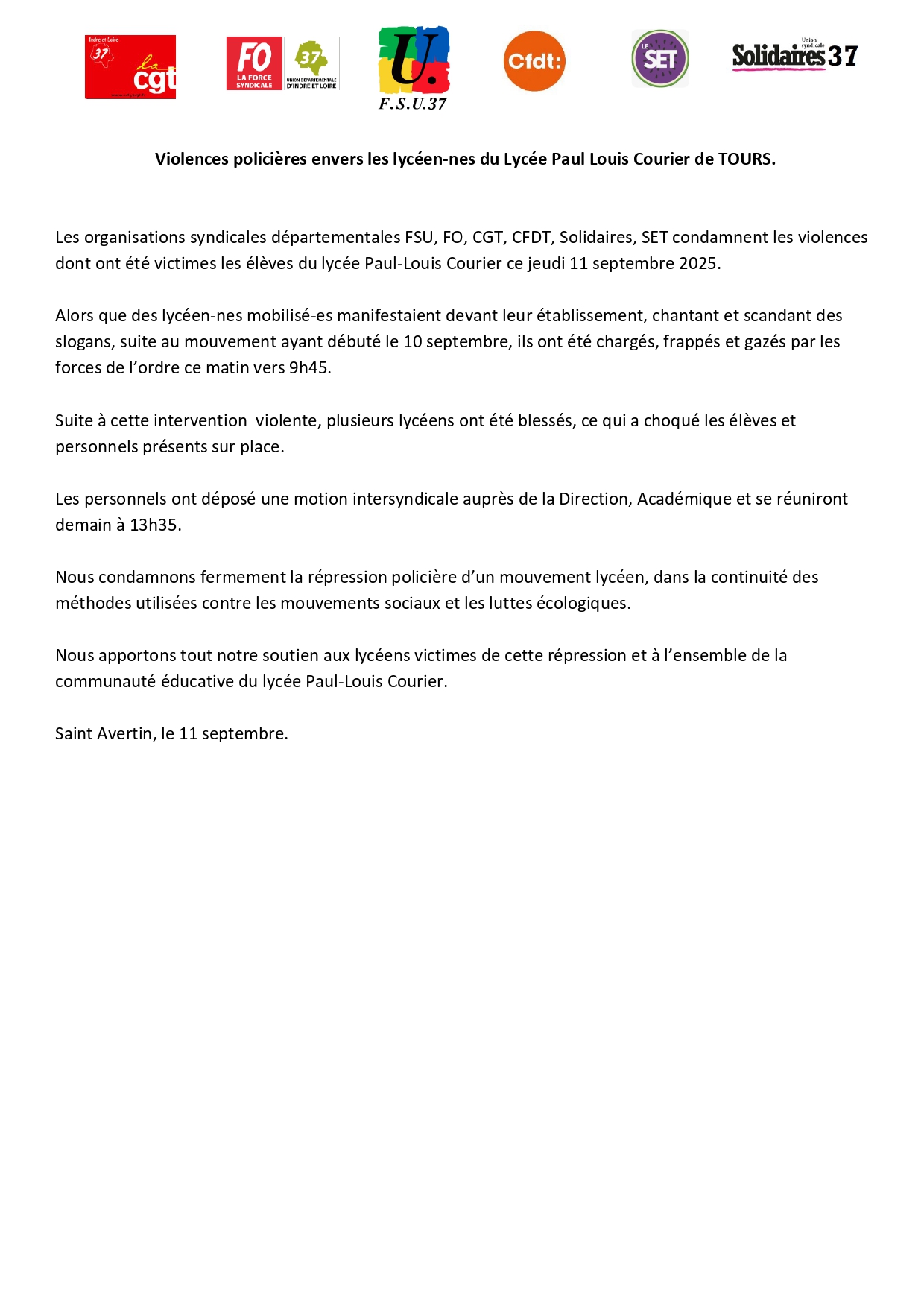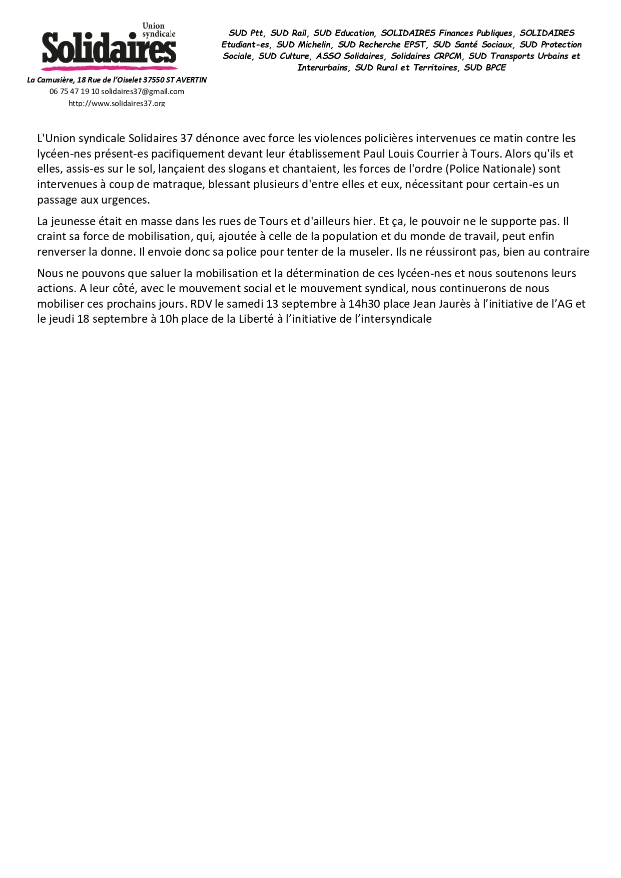 communiqués Solidaires 37 et intersyndical ci-dessous