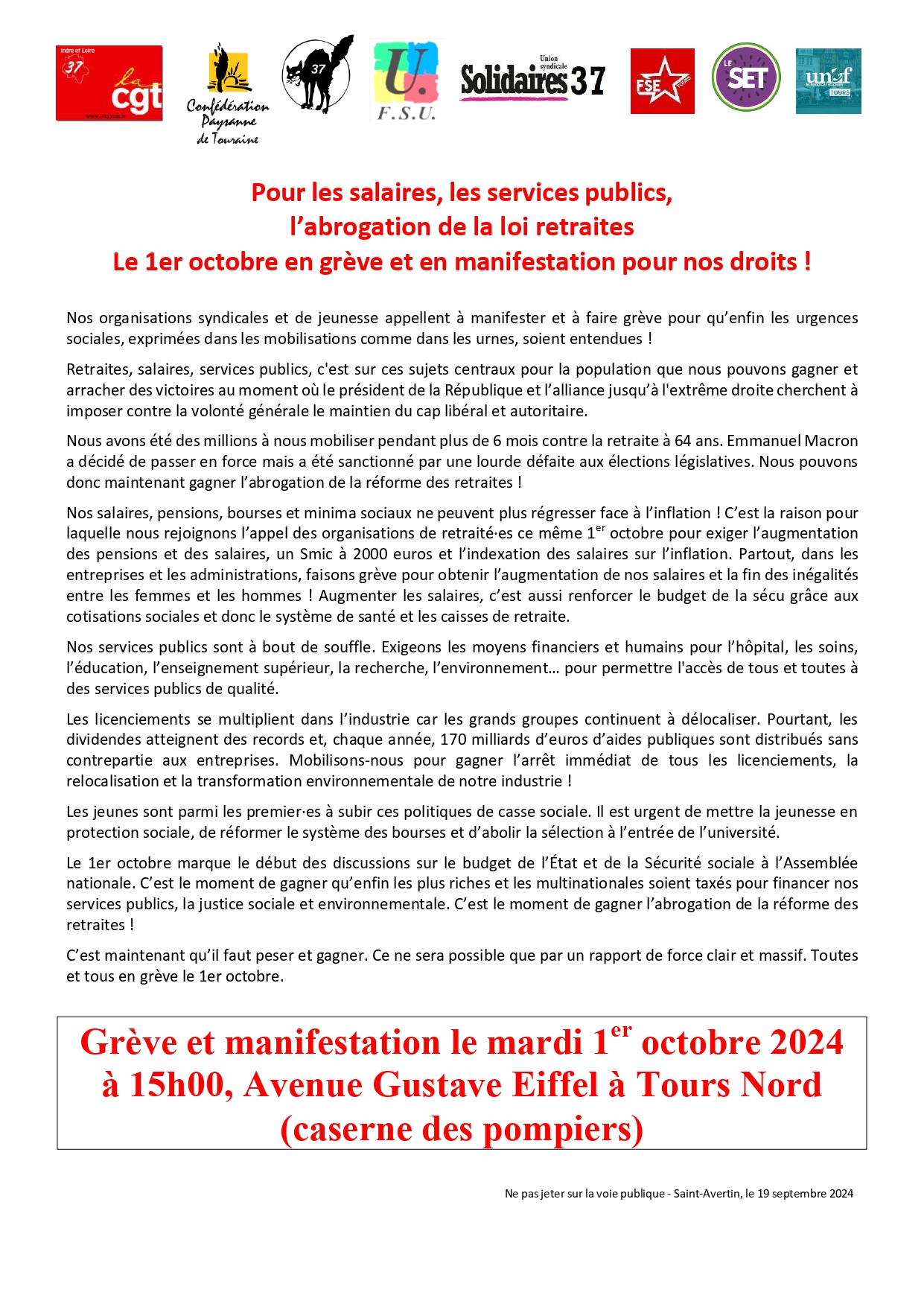 Toutes et tous en grève et en manif mardi 1er octobre, RDV à 15h Avenue Gustave Eiffel à Tours Nord (caserne des pompiers)