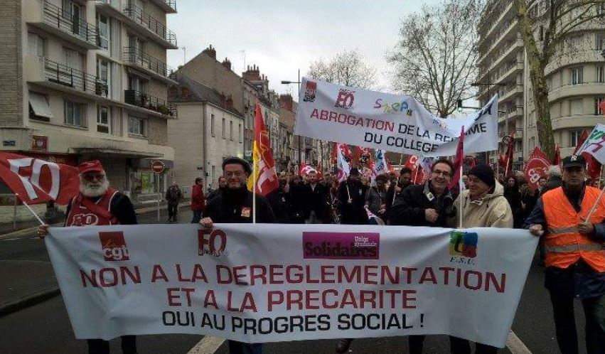 Mais la principale revendication portait sur la réforme des collèges : environ 300 enseignants avaient gonflé les rangs de la manifestation. Ils ouvraient le cortège, juste après la banderole unitaire « Non à la déréglementation et à la précarité, oui au progrès social », portant les logos de la CGT, de FO, de SUD Solidaires et de la FSU. « Rien n’a bougé du côté du ministère depuis que nous avons commencé à manifester contre cette réforme », confie Philippe Baretto de Souza, secrétaire départemental du Snes (syndicat d’enseignants du secondaire). « A la base, on commence à voir concrètement les dégâts avec les dotations horaires globales pour la rentrée prochaine. On voit que l’enseignement de l’allemand est clairement sacrifié… Par exemple, au collège Georges-Besse de Loches où j’enseigne, on va passer de 18 heures d’allemand à 11 heures ! »