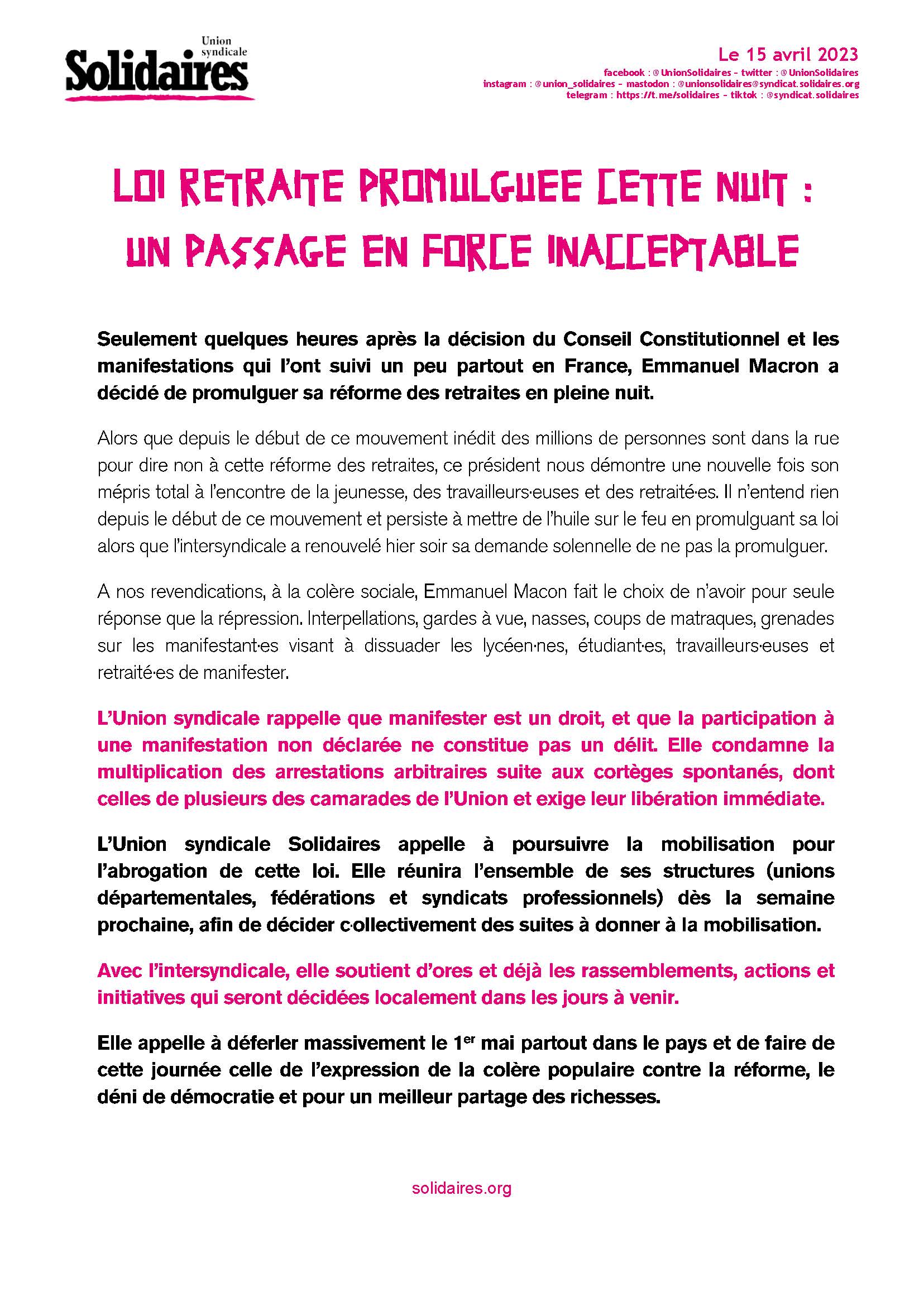 Alors que depuis le début de ce mouvement inédit des millions de personnes sont dans la rue pour dire non à cette réforme des retraites, ce président nous démontre une nouvelle fois son mépris total à l’encontre de la jeunesse, des travailleurs∙euses et des retraité∙es. Il n’entend rien depuis le début de ce mouvement et persiste à mettre de l’huile sur le feu en promulguant sa loi alors que l’intersyndicale a renouvelé hier soir sa demande solennelle de ne pas la promulguer.