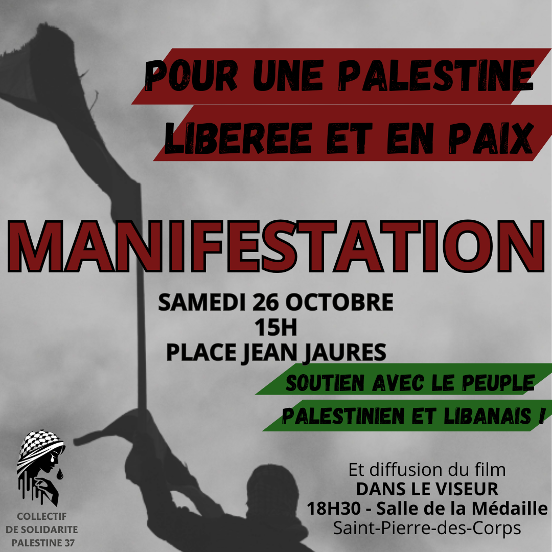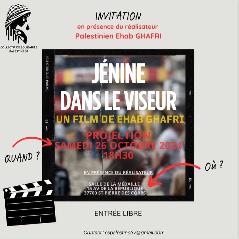 Voici deux initiatives du Collectif de Solidarité Palestine 37 pour le samedi 26 octobre : 15h rassemblement habituel place Jean Jaurès à Tours et 18h30 projection du film"Jénine dans le viseur" en présence du réalisateur à la salle de la Médaille à Saint Pierre des Corps