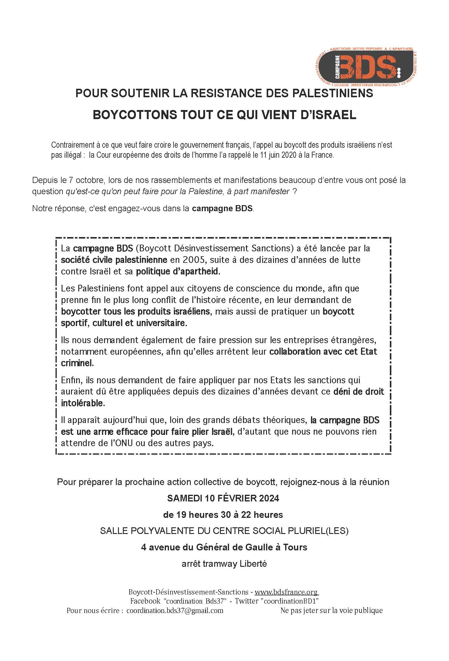 réunion publique BDS samedi 10 février à 19h30 au Centre Social Plurielles, 4 ave du Général de Gaulle, au Sanitas à Tours